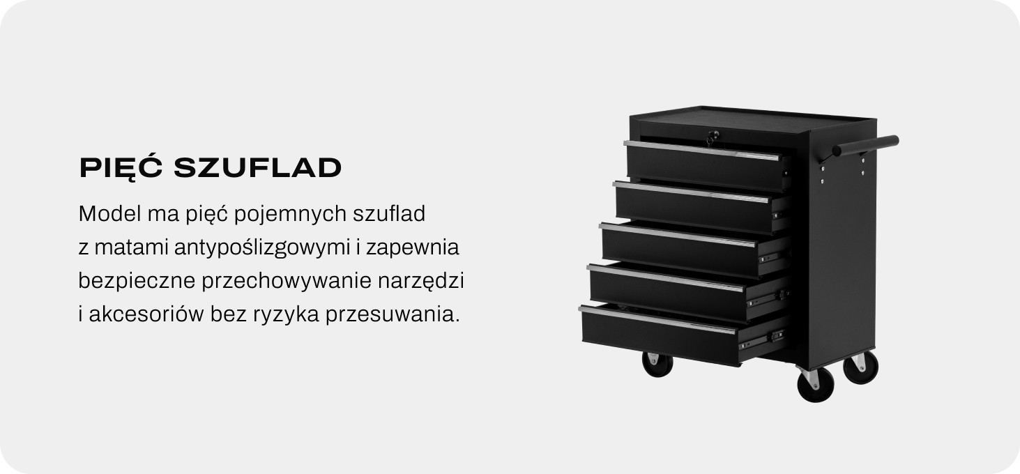 Model wyposażony jest w pięć pojemnych szuflad wykończonych matami antypoślizgowymi, a na górze znajduje się dodatkowa półka z matą antypoślizgową. Zapewniają bezpieczne przechowywanie narzędzi, tuszów i jednorazowych akcesoriów bez ryzyka ich przesuwania podczas otwierania czy przemieszczania pomocnika, wspierając utrzymanie porządku oraz sprawną organizację pracy.