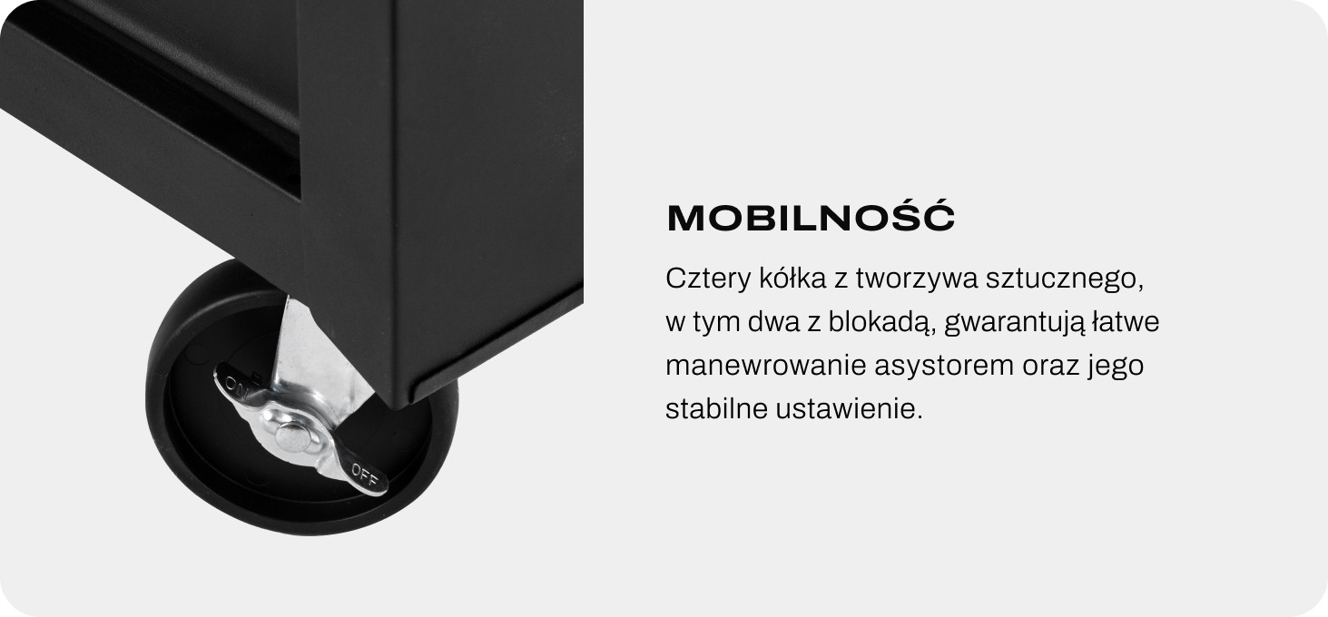 Cztery czarne kółka z tworzywa sztucznego – w tym jedna para z systemem blokady – zapewniają płynne prowadzenie oraz stabilne ustawienie asystora. Boczny uchwyt ułatwia precyzyjne manewrowanie meblem. Zamek z kluczem zabezpiecza szuflady przed samoczynnym wysuwaniem i pozwala na przechowywanie delikatniejszych elementów wyposażenia, dokumentacji lub materiałów wymagających szczególnej ostrożności.
