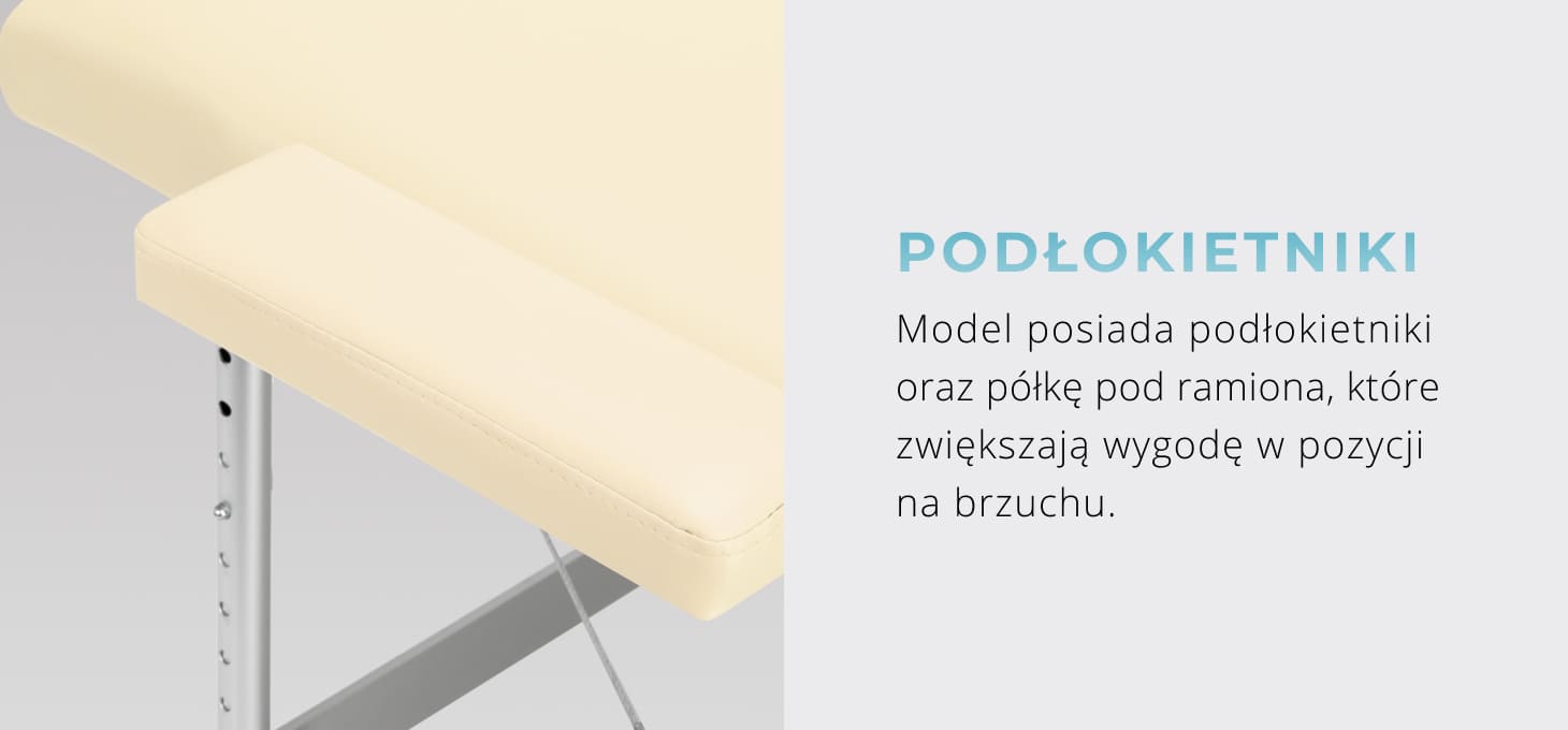 Niezależnie od rodzaju wykonywanego zabiegu czy pozycji przyjętej przez pacjenta, istotne jest odpowiednie ułożenie rąk – zapewniające odprężenie bez utrudniania pracy terapeuty. Model wyposażono w łatwe do montażu podłokietniki oraz dodatkową półkę pod ramiona, niezastąpioną przy ułożeniu na brzuchu. Rozwiązania te zwiększają funkcjonalność stołu i gwarantują wysoki komfort osobie korzystającej z zabiegu.
