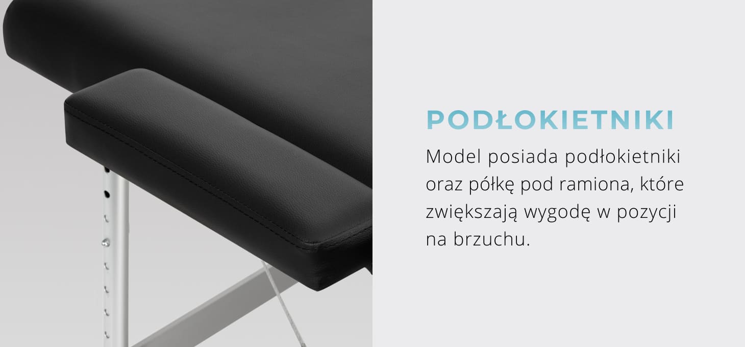 Niezależnie od rodzaju wykonywanego zabiegu czy pozycji przyjętej przez pacjenta, istotne jest odpowiednie ułożenie rąk – zapewniające odprężenie bez utrudniania pracy terapeuty. Model wyposażono w łatwe do montażu podłokietniki oraz dodatkową półkę pod ramiona, niezastąpioną przy ułożeniu na brzuchu. Rozwiązania te zwiększają funkcjonalność stołu i gwarantują wysoki komfort osobie korzystającej z zabiegu.