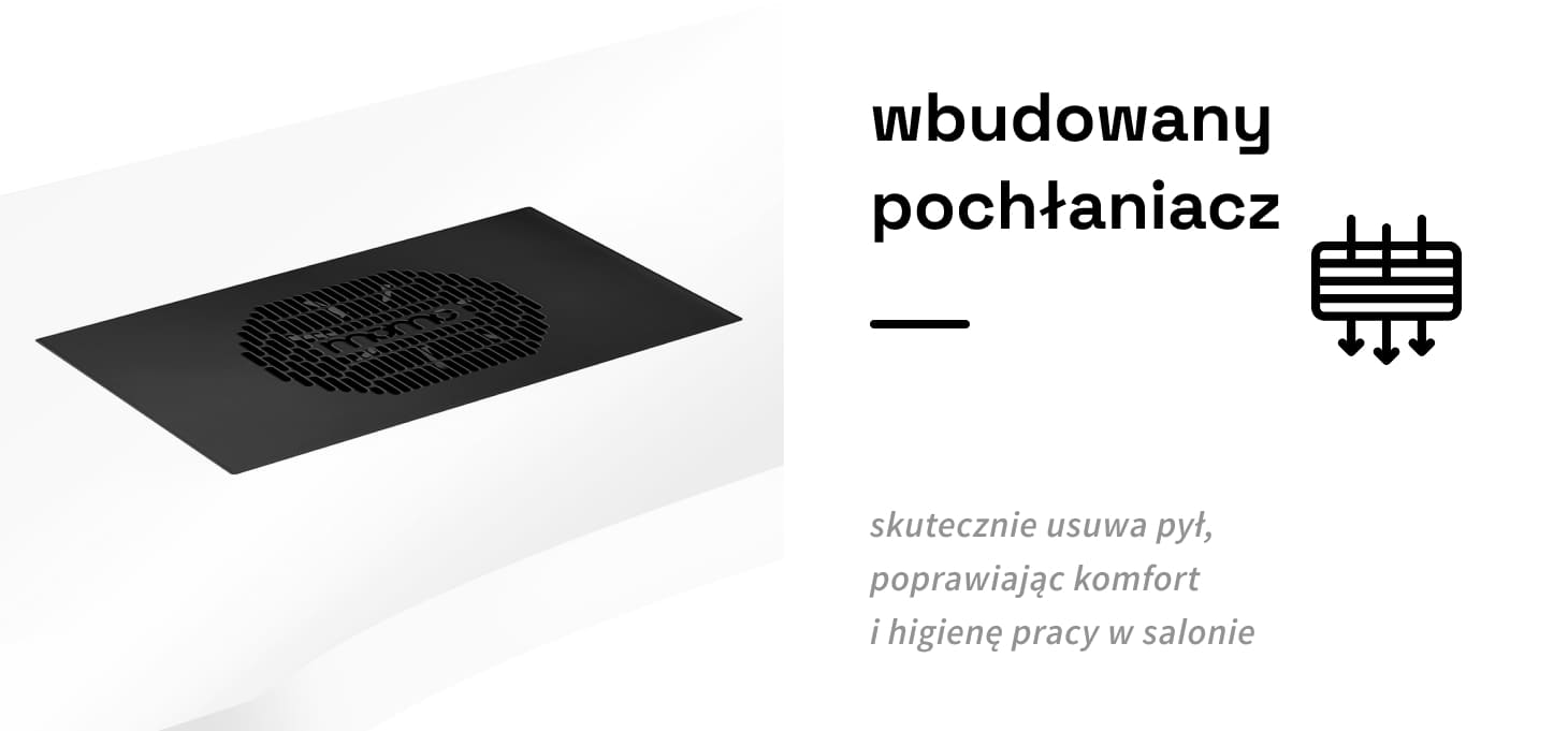 Kasetowy pochłaniacz pyłu Momo J-02 wbudowany w blat znacząco poprawia komfort i higienę pracy, skutecznie usuwając pył powstały podczas zabiegów kosmetycznych, takich jak manicure. Dzięki temu urządzeniu powietrze w salonie pozostaje czyste, a miejsce pracy wolne od zanieczyszczeń, co zwiększa bezpieczeństwo zarówno dla kosmetyczki, jak i klientów. Pochłaniacz pyłu jest łatwy w obsłudze i konserwacji, co dodatkowo podnosi jego funkcjonalność. Regularne czyszczenie oraz wymiana filtra zapewniają niezmiennie wysoką skuteczność pochłaniania. Istnieje możliwość zakupu dodatkowych filtrów wymiennych (SKU 123581). W naszym sklepie dostępny jest również filtr z aktywnym węglem (SKU 123582), który skutecznie eliminuje alergeny i drobnoustroje, podnosząc poziom higieny w salonie.