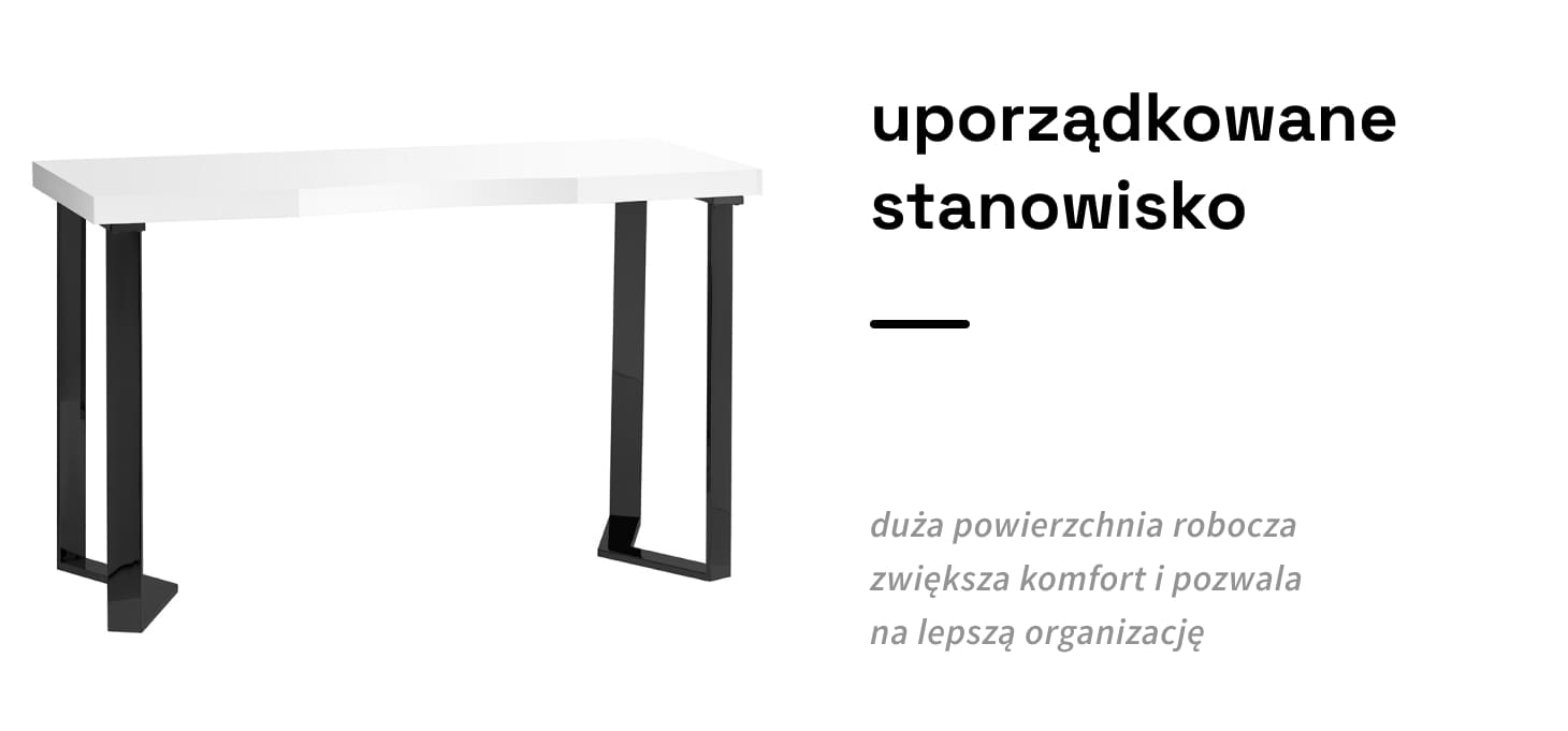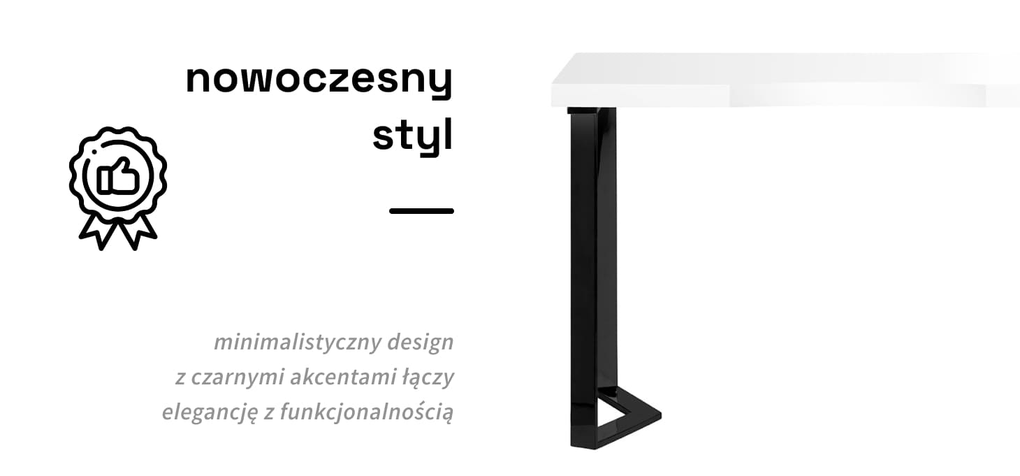 Nowoczesna forma biurka, łącząca biały blat ze czarnymi, geometrycznymi nogami, dodaje wnętrzu lekkości i elegancji. Dzięki swojej kompaktowej, a zarazem stylowej formie, biurko doskonale sprawdzi się zarówno w małych gabinetach, jak i większych, nowoczesnych wnętrzach.