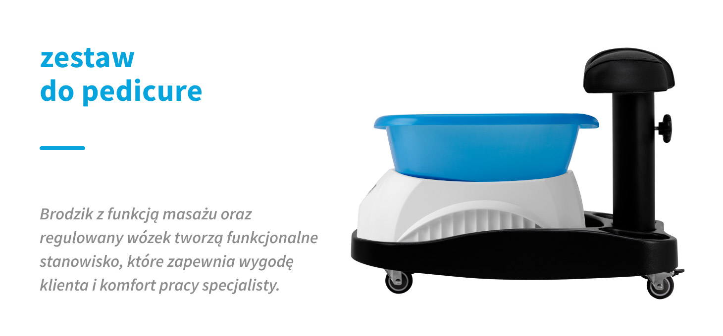 Profesjonalny zestaw Azzurro do pedicure zawiera brodzik z funkcją masażu oraz regulowany wózek, tworząc kompletne stanowisko pracy do gabinetów kosmetycznych i podologicznych. Przemyślana konstrukcja sprzyja wygodzie klienta, a jednocześnie zapewnia mobilność i komfort pracy specjalisty.