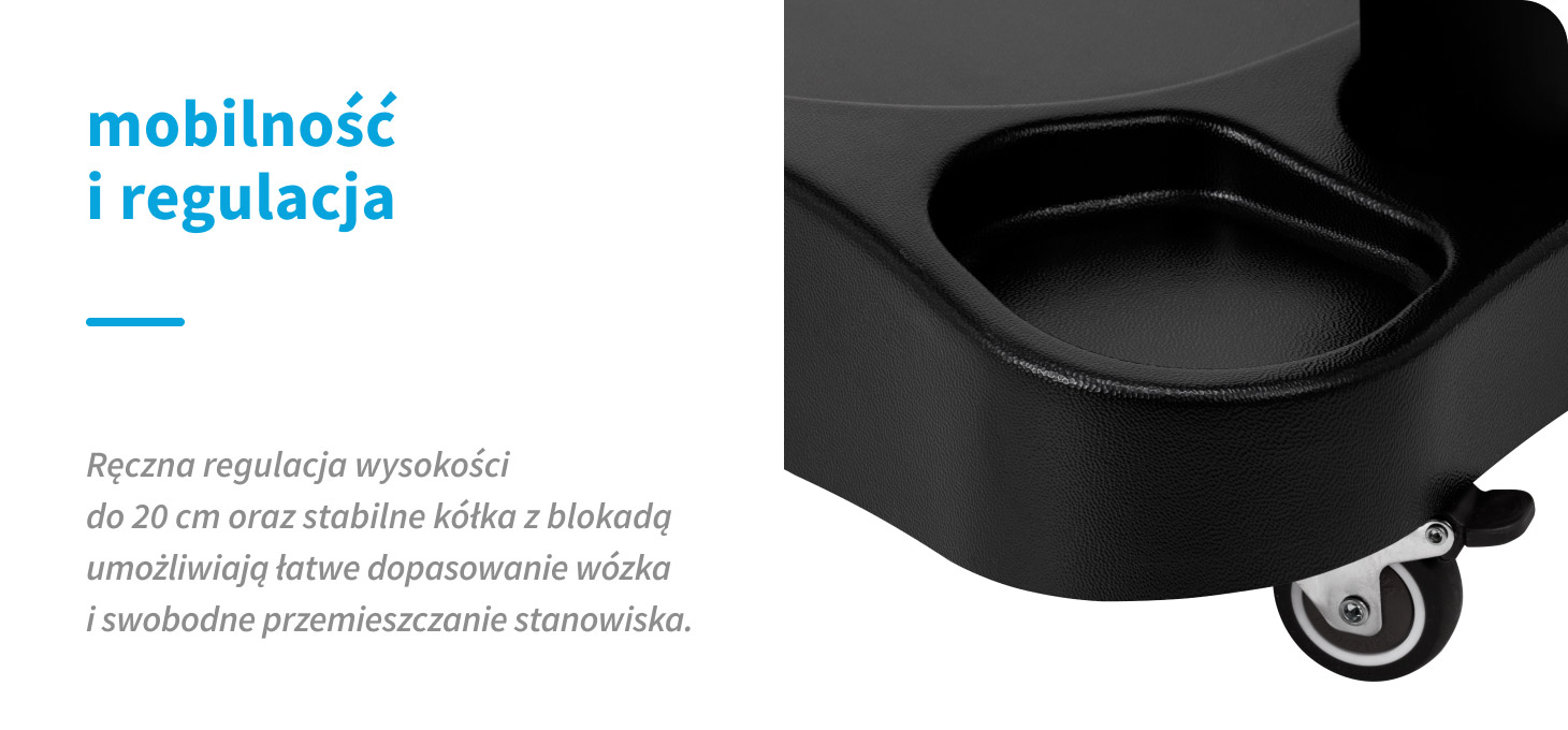 Regulowany wózek z podnóżkiem pozwala na dopasowanie pozycji do potrzeb klienta oraz osoby wykonującej zabieg. Manualna regulacja wysokości do 20 cm, odporne na wilgoć obicie ze skóry syntetycznej oraz stabilne, gumowe kółka z blokadą zapewniają komfort, mobilność i dobrą organizację stanowiska pracy.