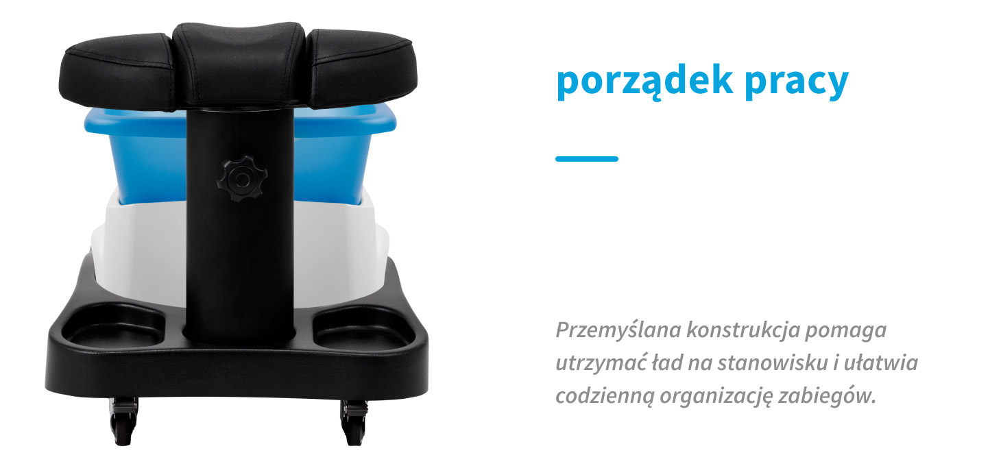 Wózek i brodzik tworzą trwały zestaw, przeznaczony do codziennej pracy w gabinetach podologicznych. Elegancki design w odcieniach czerni podkreśla nowoczesny i profesjonalny charakter stanowiska pedicure.