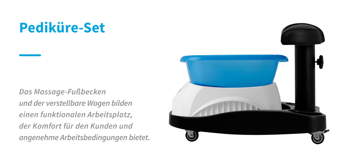 Das professionelle Azzurro Pediküre-Set umfasst eine Fußwanne mit Massagefunktion sowie einen verstellbaren Wagen und bildet eine komplette Arbeitsstation für Kosmetik- und Podologiepraxen. Die durchdachte Konstruktion erhöht den Komfort für den Kunden und sorgt gleichzeitig für Mobilität und angenehmes Arbeiten für den Behandler.