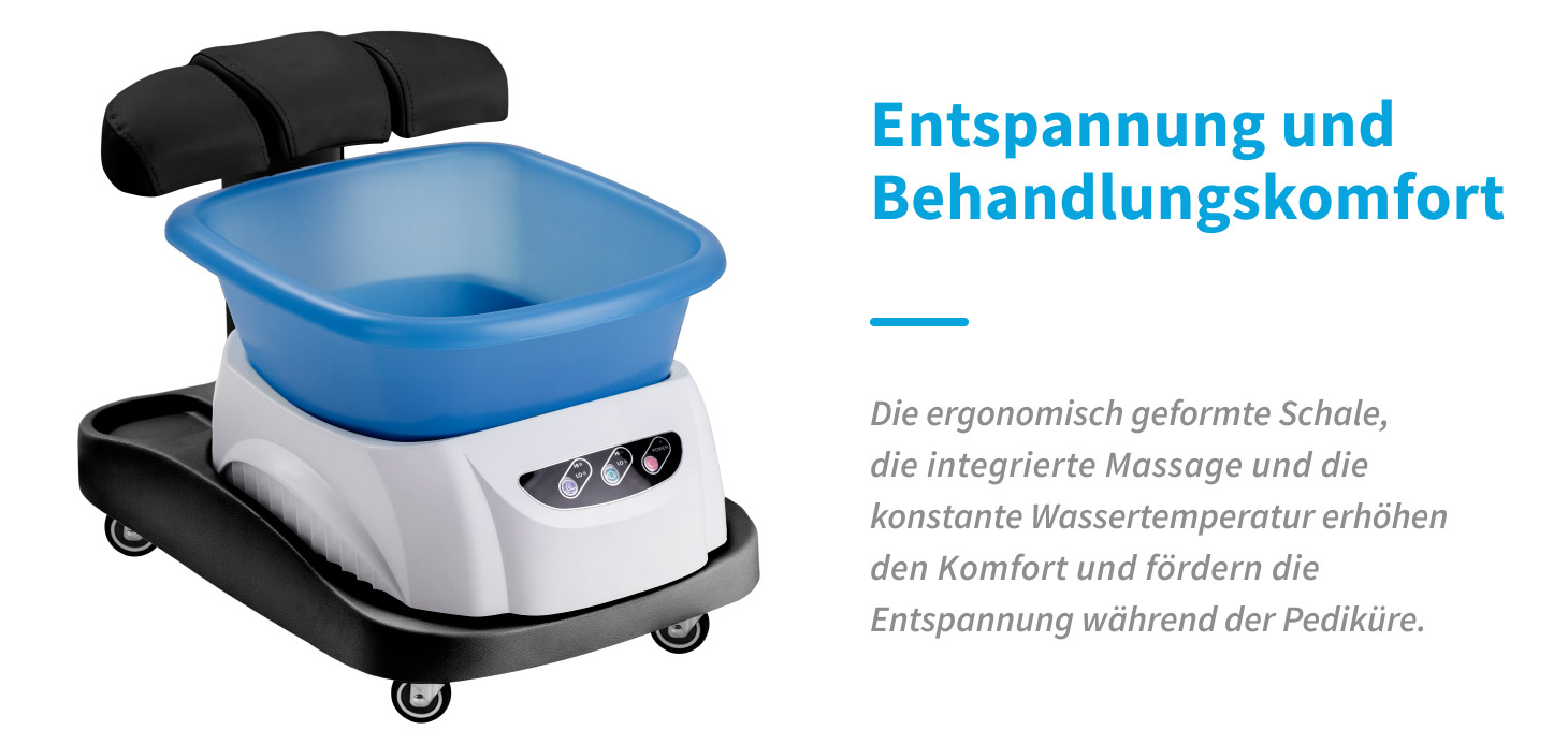 Die ergonomisch geformte Wanne ermöglicht eine bequeme Fußpositionierung, während integrierte Massagefunktionen und die konstante Wassertemperatur den Behandlungskomfort erhöhen. Die robuste Konstruktion gewährleistet Langlebigkeit bei intensiver Nutzung, und die verwendeten Materialien erleichtern die Reinigung und Hygiene.