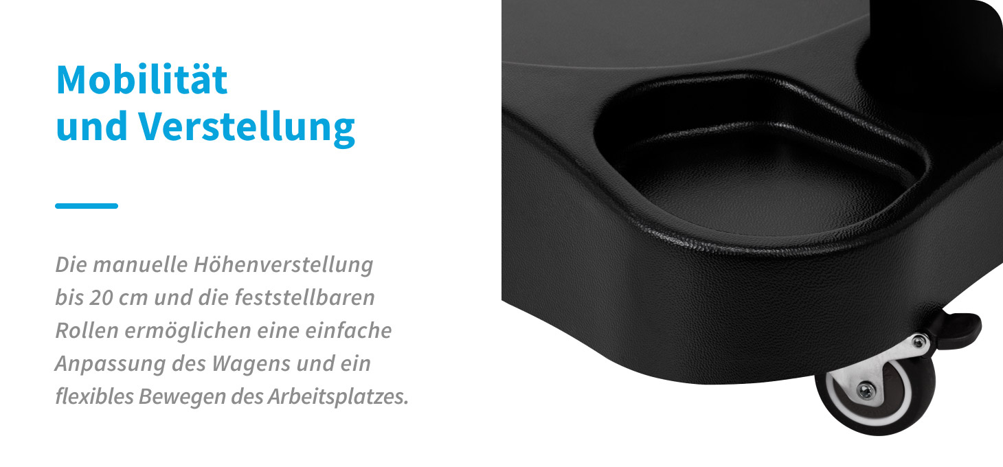 Der verstellbare Wagen mit Fußstütze ermöglicht die Anpassung der Position an die Bedürfnisse des Kunden und des Anwenders. Manuelle Höhenverstellung bis zu 20 cm, feuchtigkeitsbeständiger Bezug aus Kunstleder sowie stabile Gummiräder mit Feststellbremse sorgen für Komfort, Mobilität und eine gute Organisation des Arbeitsplatzes.