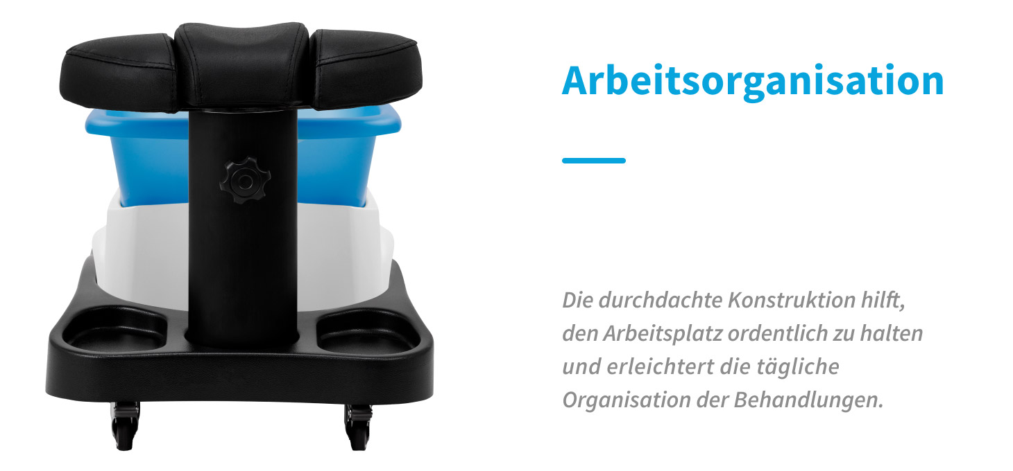 Wagen und Fußwanne bilden ein langlebiges Set, das für den täglichen Einsatz in podologischen Praxen ausgelegt ist. Das elegante Design in Schwarz unterstreicht den modernen und professionellen Charakter des Pediküre-Arbeitsplatzes.