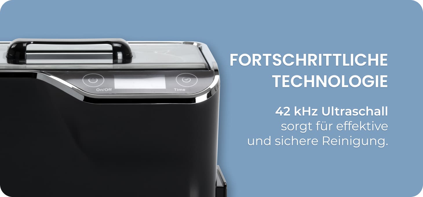 Über das praktische Display können Sie zwischen fünf Reinigungszeiteinstellungen – 90, 180, 300, 480 oder 600 Sekunden – wählen und den Vorgang an die Art und den Grad der Verschmutzung der Artikel anpassen. Die Ultraschallfrequenz von 42 kHz sorgt für eine gründliche Reinigung bei gleichzeitiger Wahrung der Sicherheit empfindlicher Oberflächen. Um die Wirksamkeit der Reinigung zu erhöhen, können Desinfektionsflüssigkeiten verwendet werden, wobei die von den Herstellern empfohlenen Konzentrationen eingehalten werden.