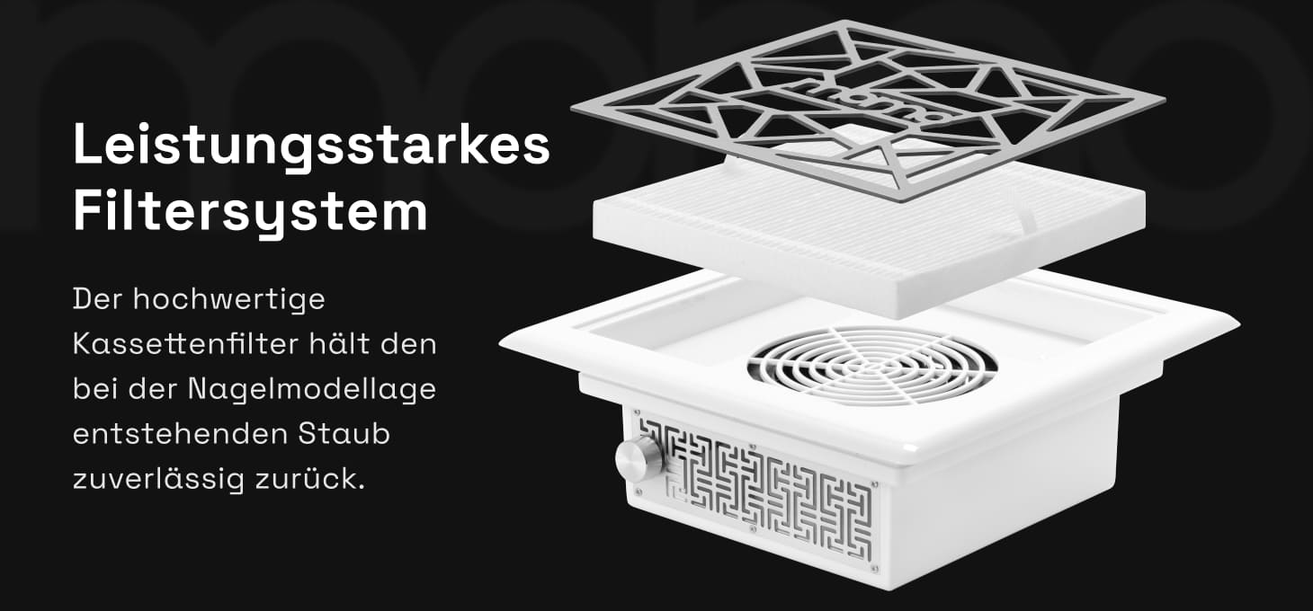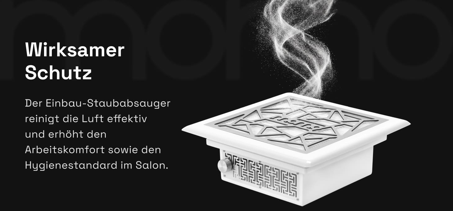 Der Einbau-Staubabsauger Momo J-404 bietet effektiven Schutz der Atemwege von Mitarbeitern und Kunden vor Feinstaub. Hohe Leistung und ein effizienter Filter sorgen für komfortable Arbeitsbedingungen bei Maniküre und Pediküre.