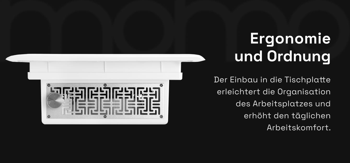 Der Einbau in die Tischplatte verbessert sowohl Ästhetik als auch Ergonomie des Arbeitsplatzes. Die elegante Abdeckung spart Platz und erleichtert die Organisation.