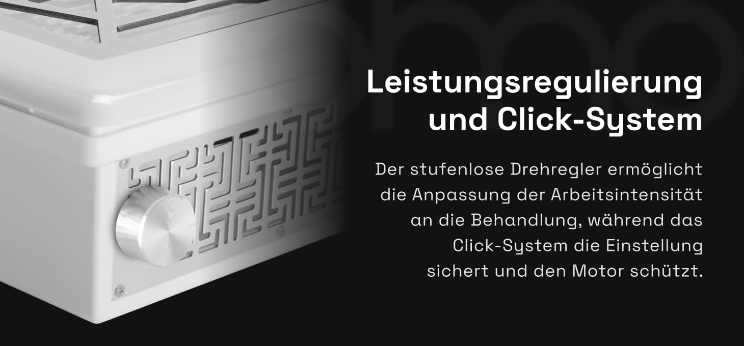Ein Drehregler erlaubt die stufenlose Leistungsanpassung. Das Click-System verhindert falsche Einstellungen und schützt den Motor vor Überlastung.