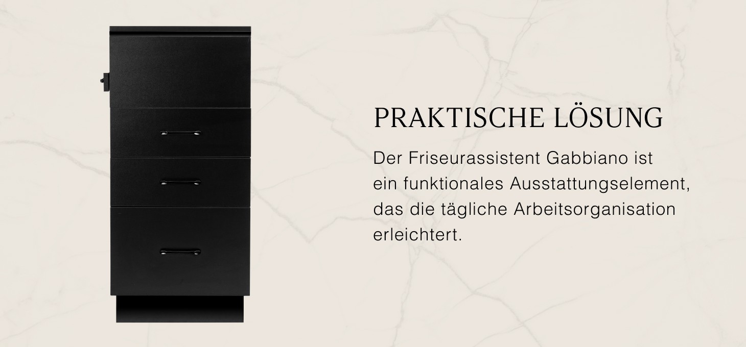 Der Friseurassistent Gabbiano 2027G ist ein elegantes Ausstattungselement, das den Charakter eines professionellen Salons unterstreicht und die tägliche Arbeitsorganisation erleichtert. Das Möbelstück zeichnet sich durch eine minimalistische Form in Schwarztönen aus, die ihm einen luxuriösen Charakter verleihen.