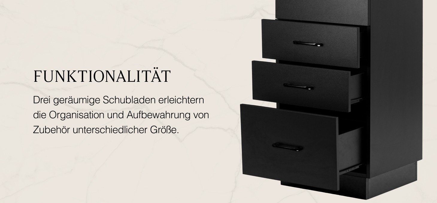 Das Modell verfügt über drei geräumige Schubladen, die Ordnung und eine übersichtliche Aufbewahrung aller notwendigen Accessoires ermöglichen. Die geeigneten Maße erleichtern das Verstauen sowohl kleiner Werkzeuge als auch größerer Friseurprodukte, sodass alles stets griffbereit ist.