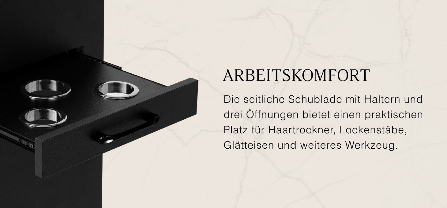 Der Assistent hat eine zusätzliche seitliche, ausziehbare Schublade mit Metallhaltern für Werkzeuge. Drei Öffnungen bieten einen stabilen Platz für Föhne, Lockenstäbe, Glätteisen oder Bürsten und ermöglichen ein bequemes Ablegen während des Stylings. Diese Lösung sorgt für einen freien Zugriff auf die wichtigsten Geräte, ohne sie auf der Arbeitsfläche ablegen zu müssen.