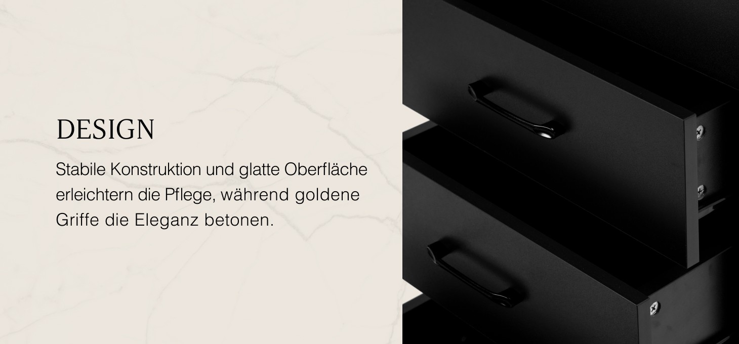 Die Kombination aus klassischem Schwarz verleiht dem Assistenten einen modernen, prestigeträchtigen Charakter, der sowohl zu minimalistischen als auch zu ausdrucksstärkeren Inneneinrichtungen passt. Die solide Konstruktion sorgt für Stabilität, und die glatte Oberfläche erleichtert die Reinigung. Die schwarzen Griffe betonen nicht nur das elegante Design, sondern ermöglichen auch ein komfortables Öffnen aller Schubladen. Eine praktische Lösung für Salons, in denen Ordnung, schneller Zugriff auf Werkzeuge und Ästhetik des Arbeitsplatzes wichtig sind.