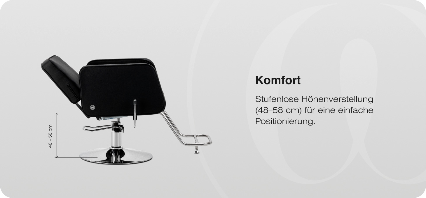 Der robuste hydraulische Hubmechanismus ermöglicht eine stufenlose Höhenverstellung des Sitzes im Bereich von 48 bis 58 cm, auch während der Nutzung des Stuhls. Diese Lösung fördert die Arbeitsergonomie und ermöglicht eine einfache Anpassung der Position an die Körpergröße des Kunden und des Friseurs. Die entsprechend geformte Rückenlehne sorgt für eine stabile Stütze des Rückens und fördert so eine bequeme Haltung auch bei längeren Behandlungen. Die integrierte Fußstütze erhöht den Komfort und bietet einen stabilen Halt für die Füße.
