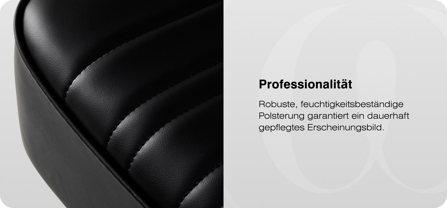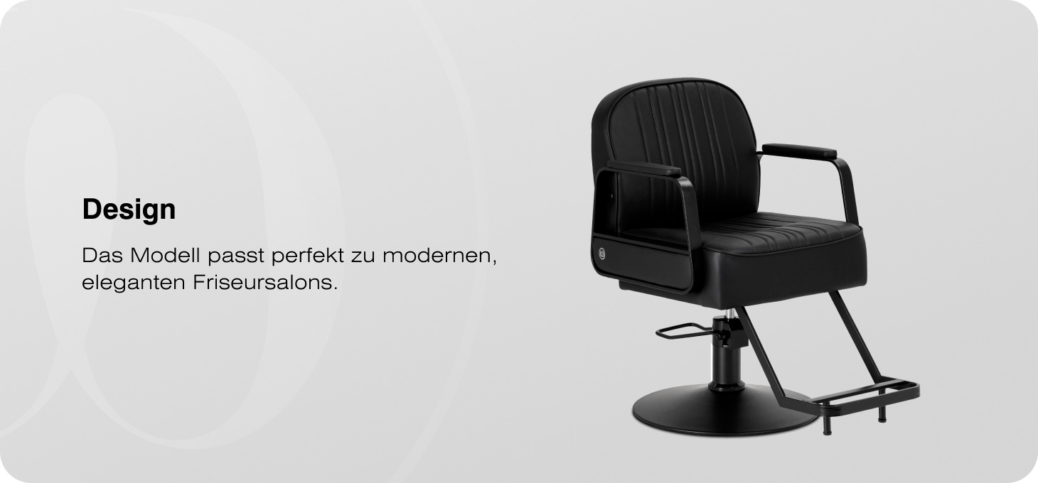 Der Stuhl zeichnet sich durch ein minimalistisches Design aus, das vom Industrial-Stil inspiriert ist und den professionellen Charakter des Salons perfekt unterstreicht. Die Polsterung aus hochwertigem Kunstleder in klassischem Schwarz, verziert mit vertikalen Ziernähten, verleiht dem Ganzen ein elegantes Aussehen. Das Bezugsmaterial zeichnet sich durch Langlebigkeit, Feuchtigkeitsbeständigkeit und Pflegeleichtigkeit aus, was auch bei intensiver Nutzung für ein ästhetisches Erscheinungsbild des Stuhls sorgt. Die Metallarmlehnen mit weichen Auflagen harmonieren mit der modernen Linienführung der Konstruktion und bieten eine bequeme Stütze für die Arme. Das matte, schwarze Gestell und die passende Fußstütze bilden eine einheitliche, stilvolle Form, die sich hervorragend sowohl in moderne als auch in eher klassische Einrichtungen von Friseur- und Barbersalons einfügt.