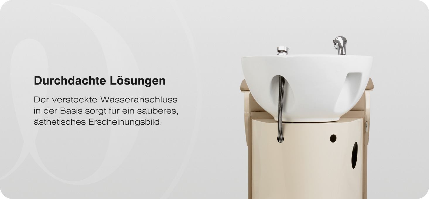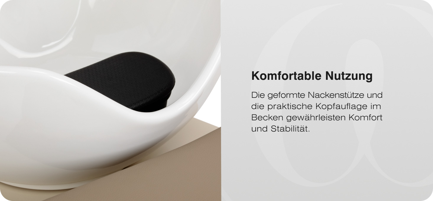 Die tiefe, abgerundete Keramikschüssel in Weißtönen begrenzt das Verspritzen von Wasser und Pflegeprodukten und trägt so zur Sauberkeit am Arbeitsplatz bei. Die langlebige Keramik zeichnet sich durch hohe Beständigkeit gegen Verfärbungen, Kratzer und chemische Einflüsse aus. Der geformte Rand sorgt für eine stabile Stütze des Kopfes des Kunden, und die praktische Stütze in der Waschschüssel ermöglicht eine bequeme Kopfhaltung. Eine Silikonauflage mindert das Kältegefühl und erhöht den Komfort des Kunden während der Behandlung.