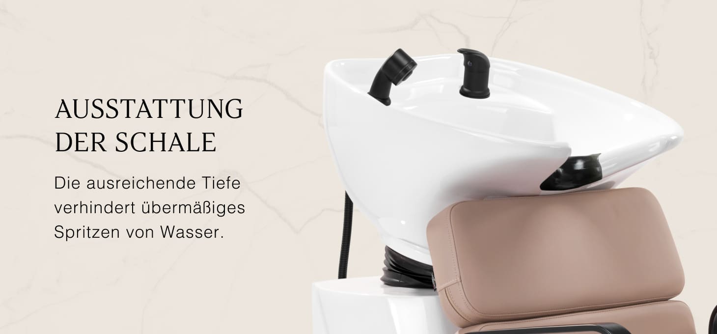 Die entsprechende Tiefe der Waschtischschale aus weißer Keramik verhindert übermäßiges Spritzen von Wasser oder Produkten, die während der Behandlung verwendet werden. So kann eine Vielzahl von Dienstleistungen komfortabel und effizient durchgeführt werden. Der Neigungswinkel der Schale lässt sich verstellen, so dass sie leicht an die individuellen Bedürfnisse angepasst werden kann. Die hohe Qualität der verwendeten Materialien macht das Waschbecken langlebig, resistent gegen Verfärbungen und Kratzer und sehr leicht zu reinigen. Ein richtig profilierter Kragen und eine geneigte Rückenlehne bieten Halt und Komfort beim Haarewaschen, und dank der bequemen Kunststoffauflage in Schwarztönen wird der Kunde keine Unannehmlichkeiten im Zusammenhang mit der Kälte der Keramikoberfläche empfinden.