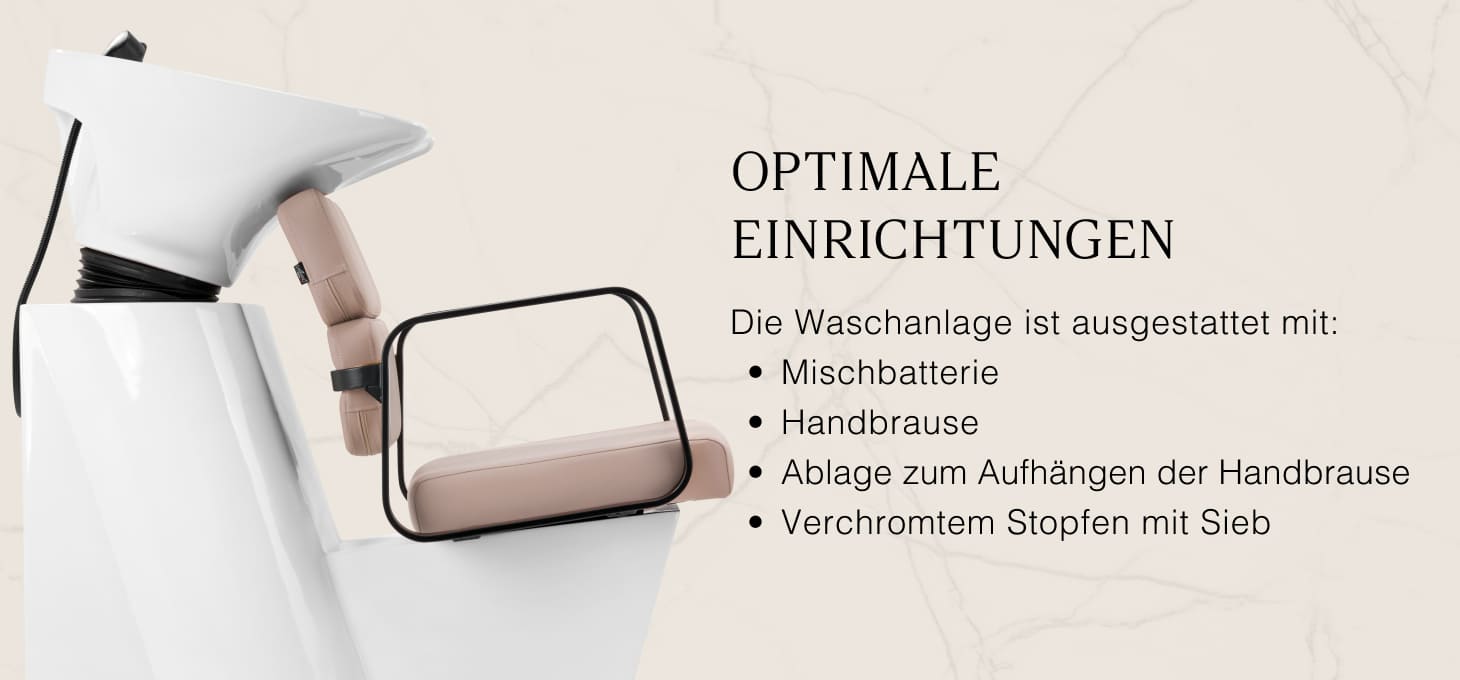Die praktische Waschanlage ist mit einem Mischerakku ausgestattet, der freien Zugang zu warmem und kaltem Wasser bietet. Dies erleichtert die Anpassung der Temperatur an die individuellen Vorlieben des Kunden. Ein spezieller Platz zum Ablegen des Hörers rationalisiert die Arbeit, und ein verchromter Stopfen mit einem speziellen Sieb ermöglicht es Ihnen, den Wasserfluss zu kontrollieren und hohe Hygienestandards im Salon aufrechtzuerhalten. Der Wasseranschluss wurde im Inneren des Sockels platziert, was ein effizientes Verbergen der Rohre ermöglicht. Ein wesentlicher Vorteil dieses Modells ist das Loch zwischen der Rückenlehne und der Sitzfläche, das es einfacher macht, das Wohnzimmer sauber zu halten, so dass Sie Schmutz leicht aus allen Ecken und Winkeln des Stuhls fegen können. Die Waschanlage wurde so profiliert, dass sie den Komfort während der verschiedenen Behandlungen gewährleistet und eine angemessene Rückenstütze garantiert. Die Kombination aus Funktionalität und Ausstattung macht das Arbeiten in einem Friseursalon noch komfortabler.