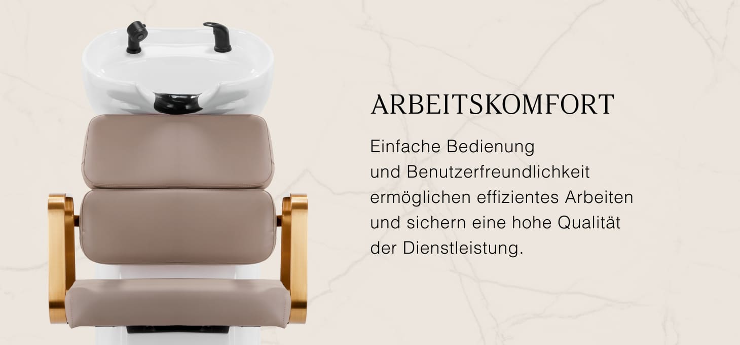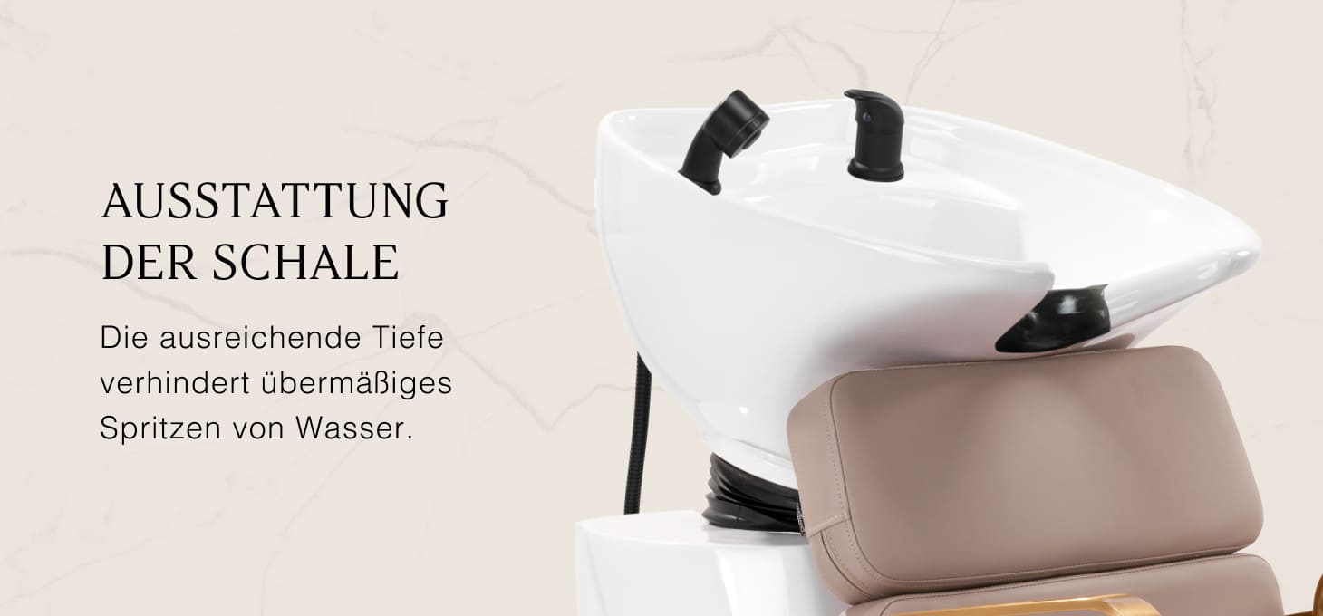 Die entsprechende Tiefe der Waschtischschale aus weißer Keramik verhindert übermäßiges Spritzen von Wasser oder Produkten, die während der Behandlung verwendet werden. So kann eine Vielzahl von Dienstleistungen komfortabel und effizient durchgeführt werden. Der Neigungswinkel der Schale lässt sich verstellen, so dass sie leicht an die individuellen Bedürfnisse angepasst werden kann. Die hohe Qualität der verwendeten Materialien macht das Waschbecken langlebig, resistent gegen Verfärbungen und Kratzer und sehr leicht zu reinigen. Ein richtig profilierter Kragen und eine geneigte Rückenlehne bieten Halt und Komfort beim Haarewaschen, und dank der bequemen Kunststoffauflage in Schwarztönen wird der Kunde keine Unannehmlichkeiten im Zusammenhang mit der Kälte der Keramikoberfläche empfinden.