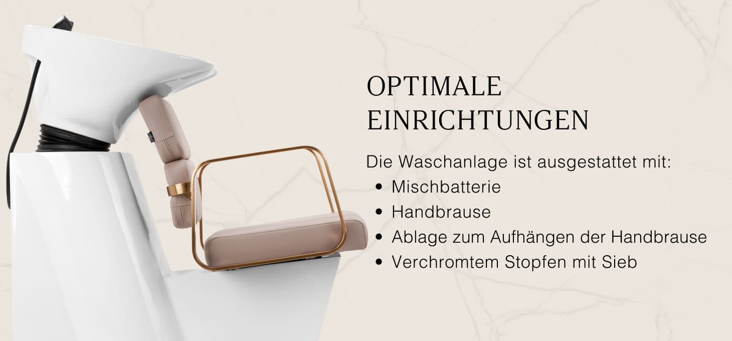 Die praktische Waschanlage ist mit einem Mischerakku ausgestattet, der freien Zugang zu warmem und kaltem Wasser bietet. Dies erleichtert die Anpassung der Temperatur an die individuellen Vorlieben des Kunden. Ein spezieller Platz zum Ablegen des Hörers rationalisiert die Arbeit, und ein verchromter Stopfen mit einem speziellen Sieb ermöglicht es Ihnen, den Wasserfluss zu kontrollieren und hohe Hygienestandards im Salon aufrechtzuerhalten. Der Wasseranschluss wurde im Inneren des Sockels platziert, was ein effizientes Verbergen der Rohre ermöglicht. Ein wesentlicher Vorteil dieses Modells ist das Loch zwischen der Rückenlehne und der Sitzfläche, das es einfacher macht, das Wohnzimmer sauber zu halten, so dass Sie Schmutz leicht aus allen Ecken und Winkeln des Stuhls fegen können. Die Waschanlage wurde so profiliert, dass sie den Komfort während der verschiedenen Behandlungen gewährleistet und eine angemessene Rückenstütze garantiert. Die Kombination aus Funktionalität und Ausstattung macht das Arbeiten in einem Friseursalon noch komfortabler.