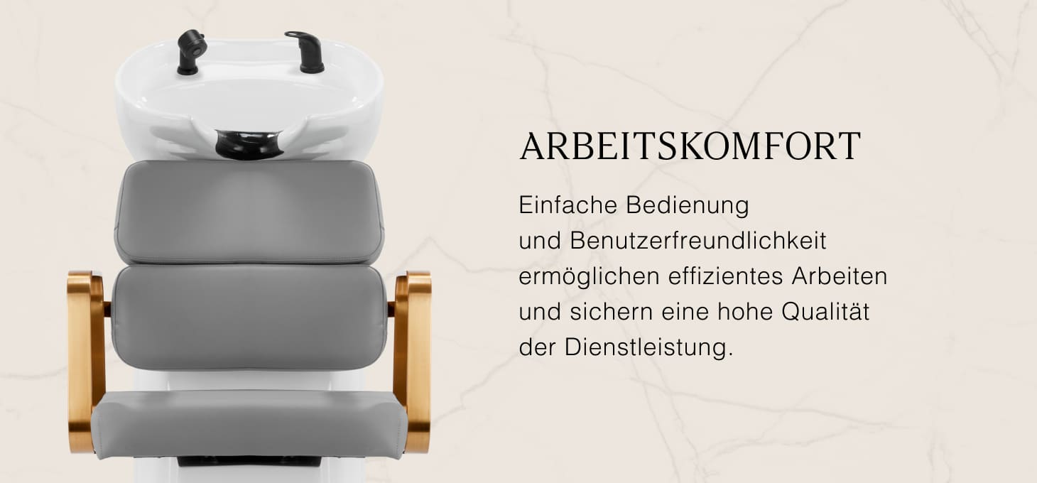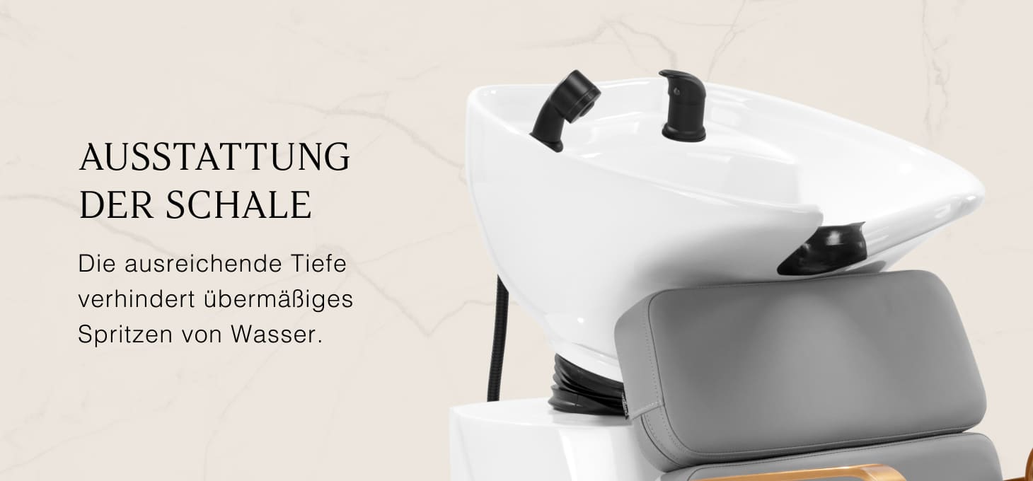 Die entsprechende Tiefe der Waschtischschale aus weißer Keramik verhindert übermäßiges Spritzen von Wasser oder Produkten, die während der Behandlung verwendet werden. So kann eine Vielzahl von Dienstleistungen komfortabel und effizient durchgeführt werden. Der Neigungswinkel der Schale lässt sich verstellen, so dass sie leicht an die individuellen Bedürfnisse angepasst werden kann. Die hohe Qualität der verwendeten Materialien macht das Waschbecken langlebig, resistent gegen Verfärbungen und Kratzer und sehr leicht zu reinigen. Ein richtig profilierter Kragen und eine geneigte Rückenlehne bieten Halt und Komfort beim Haarewaschen, und dank der bequemen Kunststoffauflage in Schwarztönen wird der Kunde keine Unannehmlichkeiten im Zusammenhang mit der Kälte der Keramikoberfläche empfinden.