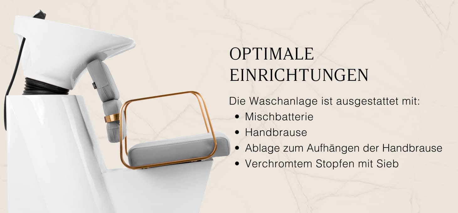 Die praktische Waschanlage ist mit einem Mischerakku ausgestattet, der freien Zugang zu warmem und kaltem Wasser bietet. Dies erleichtert die Anpassung der Temperatur an die individuellen Vorlieben des Kunden. Ein spezieller Platz zum Ablegen des Hörers rationalisiert die Arbeit, und ein verchromter Stopfen mit einem speziellen Sieb ermöglicht es Ihnen, den Wasserfluss zu kontrollieren und hohe Hygienestandards im Salon aufrechtzuerhalten. Der Wasseranschluss wurde im Inneren des Sockels platziert, was ein effizientes Verbergen der Rohre ermöglicht. Ein wesentlicher Vorteil dieses Modells ist das Loch zwischen der Rückenlehne und der Sitzfläche, das es einfacher macht, das Wohnzimmer sauber zu halten, so dass Sie Schmutz leicht aus allen Ecken und Winkeln des Stuhls fegen können. Die Waschanlage wurde so profiliert, dass sie den Komfort während der verschiedenen Behandlungen gewährleistet und eine angemessene Rückenstütze garantiert. Die Kombination aus Funktionalität und Ausstattung macht das Arbeiten in einem Friseursalon noch komfortabler.