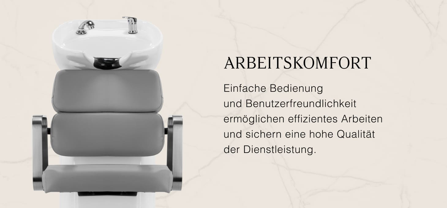 Die entsprechende Tiefe der Waschtischschale aus weißer Keramik verhindert übermäßiges Spritzen von Wasser oder Produkten, die während der Behandlung verwendet werden. So kann eine Vielzahl von Dienstleistungen komfortabel und effizient durchgeführt werden. Der Neigungswinkel der Schale lässt sich verstellen, so dass sie leicht an die individuellen Bedürfnisse angepasst werden kann. Die hohe Qualität der verwendeten Materialien macht das Waschbecken langlebig, resistent gegen Verfärbungen und Kratzer und sehr leicht zu reinigen. Ein richtig profilierter Kragen und eine geneigte Rückenlehne bieten Halt und Komfort beim Haarewaschen, und dank der bequemen Kunststoffauflage in Schwarztönen wird der Kunde keine Unannehmlichkeiten im Zusammenhang mit der Kälte der Keramikoberfläche empfinden.