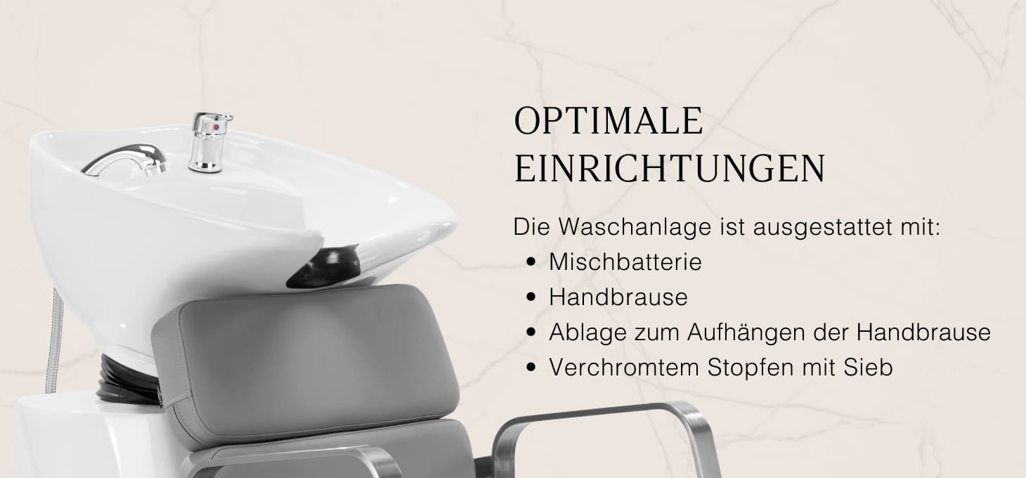 Die praktische Waschanlage ist mit einem Mischerakku ausgestattet, der freien Zugang zu warmem und kaltem Wasser bietet. Dies erleichtert die Anpassung der Temperatur an die individuellen Vorlieben des Kunden. Ein spezieller Platz zum Ablegen des Hörers rationalisiert die Arbeit, und ein verchromter Stopfen mit einem speziellen Sieb ermöglicht es Ihnen, den Wasserfluss zu kontrollieren und hohe Hygienestandards im Salon aufrechtzuerhalten. Der Wasseranschluss wurde im Inneren des Sockels platziert, was ein effizientes Verbergen der Rohre ermöglicht. Ein wesentlicher Vorteil dieses Modells ist das Loch zwischen der Rückenlehne und der Sitzfläche, das es einfacher macht, das Wohnzimmer sauber zu halten, so dass Sie Schmutz leicht aus allen Ecken und Winkeln des Stuhls fegen können. Die Waschanlage wurde so profiliert, dass sie den Komfort während der verschiedenen Behandlungen gewährleistet und eine angemessene Rückenstütze garantiert. Die Kombination aus Funktionalität und Ausstattung macht das Arbeiten in einem Friseursalon noch komfortabler.