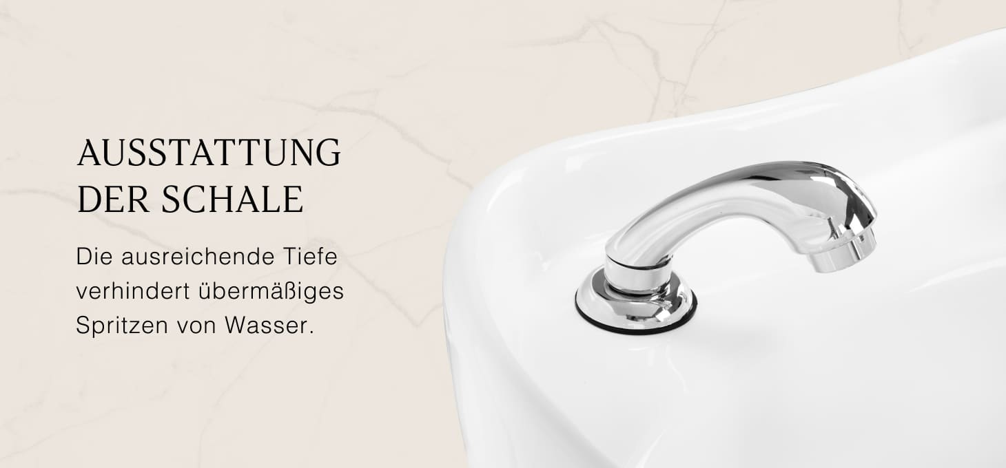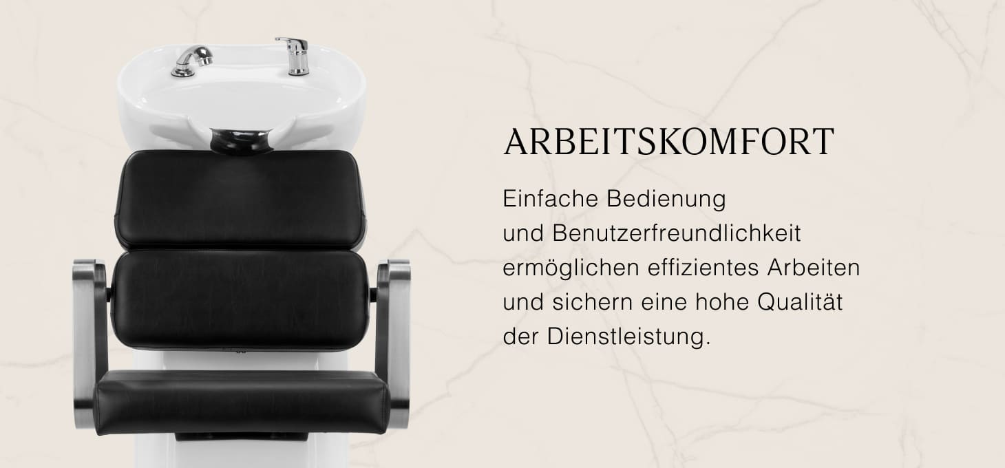 Die entsprechende Tiefe der Waschtischschale aus weißer Keramik verhindert übermäßiges Spritzen von Wasser oder Produkten, die während der Behandlung verwendet werden. So kann eine Vielzahl von Dienstleistungen komfortabel und effizient durchgeführt werden. Der Neigungswinkel der Schale lässt sich verstellen, so dass sie leicht an die individuellen Bedürfnisse angepasst werden kann. Die hohe Qualität der verwendeten Materialien macht das Waschbecken langlebig, resistent gegen Verfärbungen und Kratzer und sehr leicht zu reinigen. Ein richtig profilierter Kragen und eine geneigte Rückenlehne bieten Halt und Komfort beim Haarewaschen, und dank der bequemen Kunststoffauflage in Schwarztönen wird der Kunde keine Unannehmlichkeiten im Zusammenhang mit der Kälte der Keramikoberfläche empfinden.