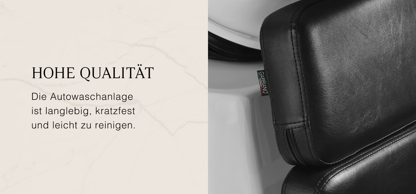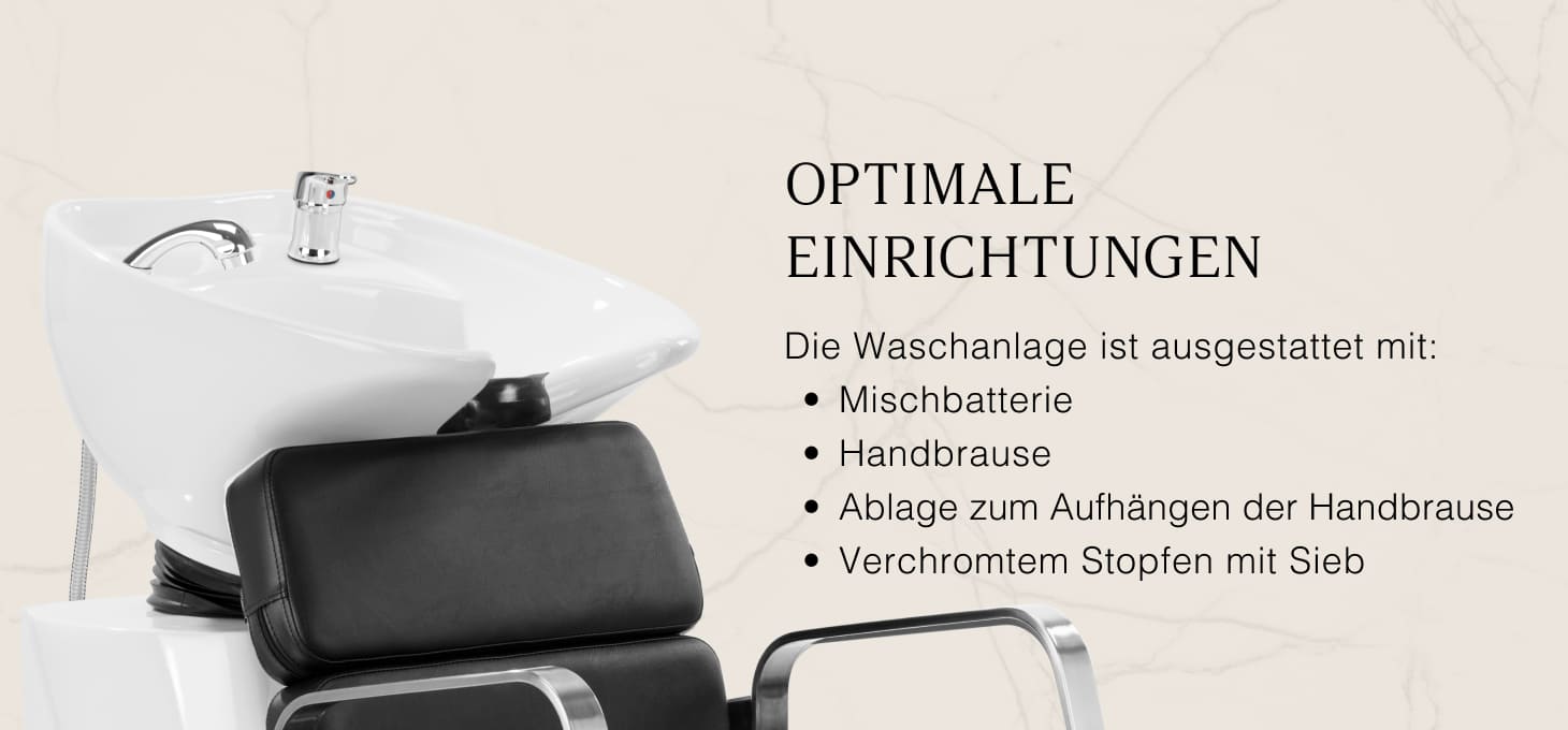 Der profilierte Stuhl bietet eine ausreichende Lendenwirbelstütze und damit einen hohen Nutzungskomfort. Armlehnen aus Metall in Chrometönen mit geometrischer Form ermöglichen die korrekte Positionierung der Schultern des Kunden. Die Füllung aus strapazierfähigem, verformungsbeständigem Schaumstoff und die Polsterung aus angenehm haptischem Kunstleder sorgen für die Langlebigkeit der Möbel, die einfache Reinigung und den Nutzungskomfort über einen langen Zeitraum. Das originelle, elegante Erscheinungsbild der Waschanlage verleiht den Innenräumen einen einzigartigen Ausdruck. Ein kompletter Satz Armaturen in Chrometönen ist im Lieferumfang enthalten, einschließlich eines Wasserhahns, eines Duschkopfs und spezieller Schläuche, um einen kompletten Satz Werkzeuge für die Arbeit bereitzustellen.