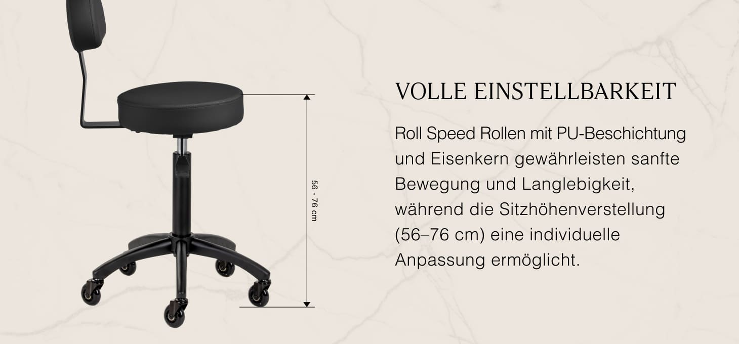 Die Sitzhöhenverstellung im Bereich von 56-76 cm ermöglicht es Ihnen, die Position bei der Erbringung von Dienstleistungen an die individuellen Bedürfnisse des Fachmanns anzupassen. Die Rückenlehne stützt die Wirbelsäule und sorgt so für Komfort auch bei längerer Arbeit. Der Vollrotationsmechanismus erhöht die Bewegungsfreiheit, was sich in mehr Komfort und Effizienz der Arbeit niederschlägt. Für Beweglichkeit sorgen die Roll Speed-Räder mit Eisenkern und Polyurethan (PU)-Beschichtung, die eine reibungslose Bewegung mit außergewöhnlicher Verschleißfestigkeit verbinden. Durch die Verwendung von Lagern der ABEC-7-Klasse lässt sich der Hocker leicht bewegen, was das Manövrieren erheblich erleichtert.