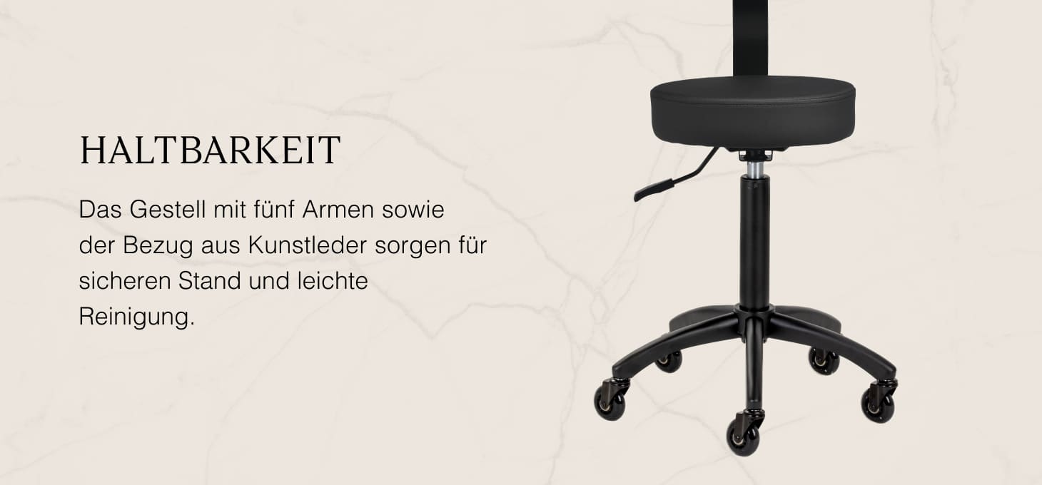 Der Hocker ist auf einem fünfarmigen, schwarzen Gestell mit halbmattem Finish montiert, das auch bei intensiver Nutzung eine hervorragende Stabilität gewährleistet. Der Sitz ist mit strapazierfähigem Kunstleder in eleganten Schwarztönen bezogen, das gegen Feuchtigkeit, Schmutz und den täglichen Gebrauch beständig ist, und die Schaumstofffüllung behält auch bei längerer Belastung ihre Form. Durch das moderne, ästhetische Erscheinungsbild fügt sich der Hocker perfekt in professionelle Innenräume ein. Es ist eine praktische und elegante Wahl für Friseure, Schönheitssalons und Salons, bei denen Arbeitskomfort, solide Verarbeitung und stilvolle Ausstattung wichtig sind.
