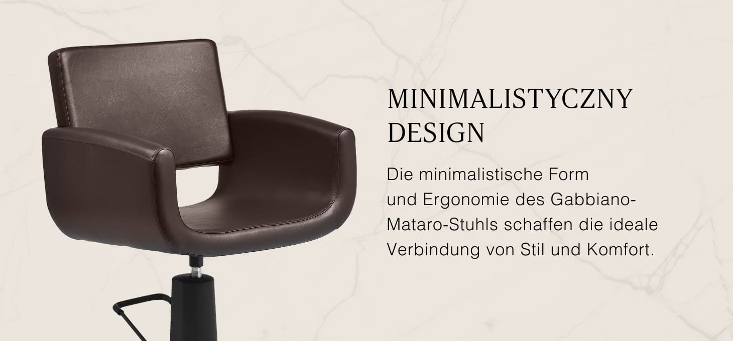 Der Friseurstuhl Gabbiano Mataro ist eine Kombination aus moderner Schlichtheit und Funktionalität. Dezent abgerundete Linien verleihen ihm eine Leichtigkeit, und ein stabiler, runder Sockel in mattem Braun unterstreicht seinen professionellen Look. Der Sitz mit angenehm anzufassendem Kunstleder in Schwarztönen sorgt für Komfort auch bei langen Behandlungen. Sorgfältig ausgewählte Materialien sorgen für Langlebigkeit, Feuchtigkeitsbeständigkeit und einfache Reinigung. Der Sessel passt sowohl zu modernen als auch zu klassischen Arrangements und unterstreicht den Stil und Charakter des Salons.