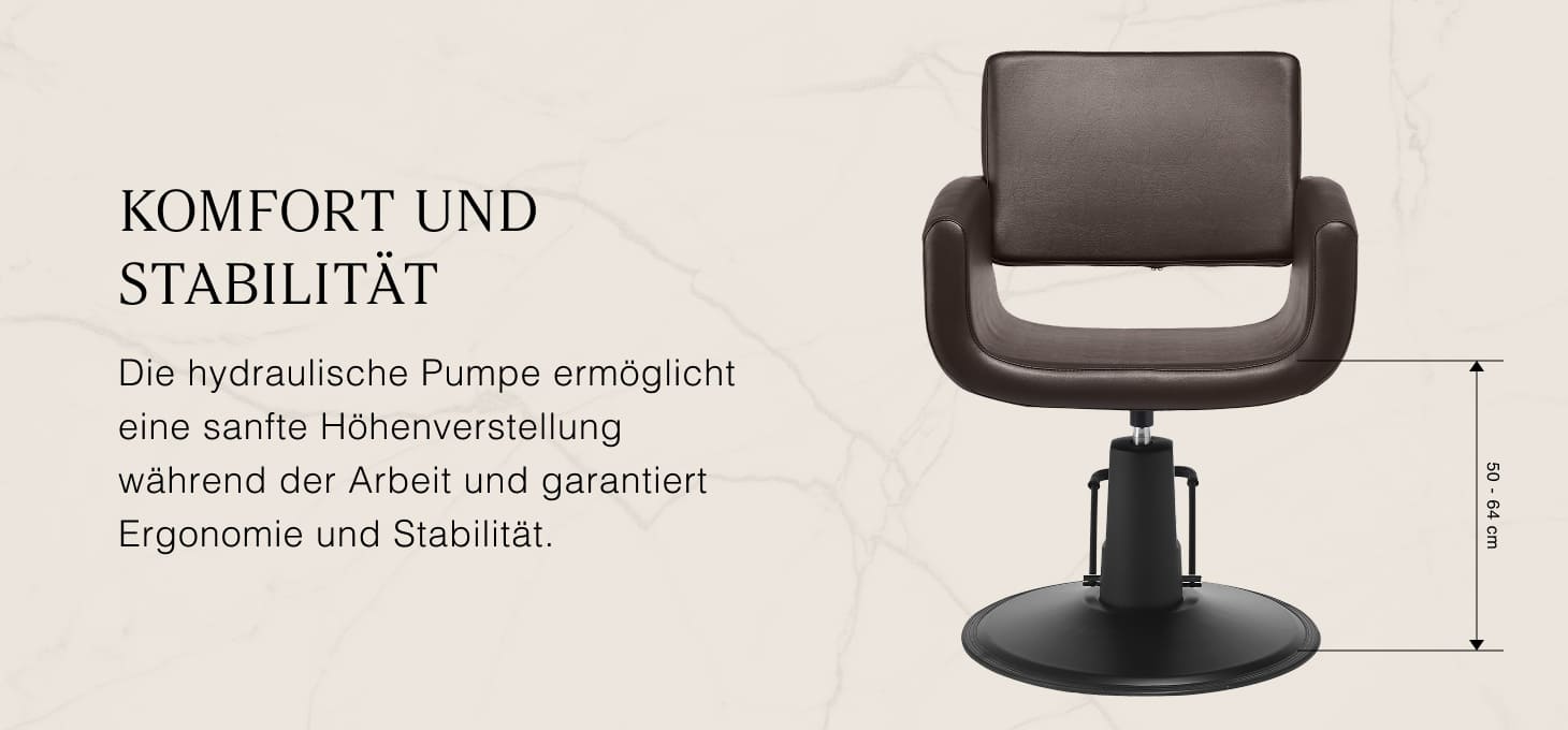 Mit dem langlebigen hydraulischen Wagenheber können Sie die Höhe des Sitzes auch während des Gebrauchs von 50 bis 64 cm einstellen. Dadurch wird die Arbeit ergonomischer und weniger belastend, und die Position kann sowohl an die Körpergröße des Friseurs als auch an die des Kunden angepasst werden. Die bequeme Rückenlehne bietet eine stabile Rückenstütze und erleichtert das Einnehmen einer bequemen Position, was besonders bei langen Behandlungen wichtig ist, um den Komfort und die Kundenzufriedenheit zu erhöhen.