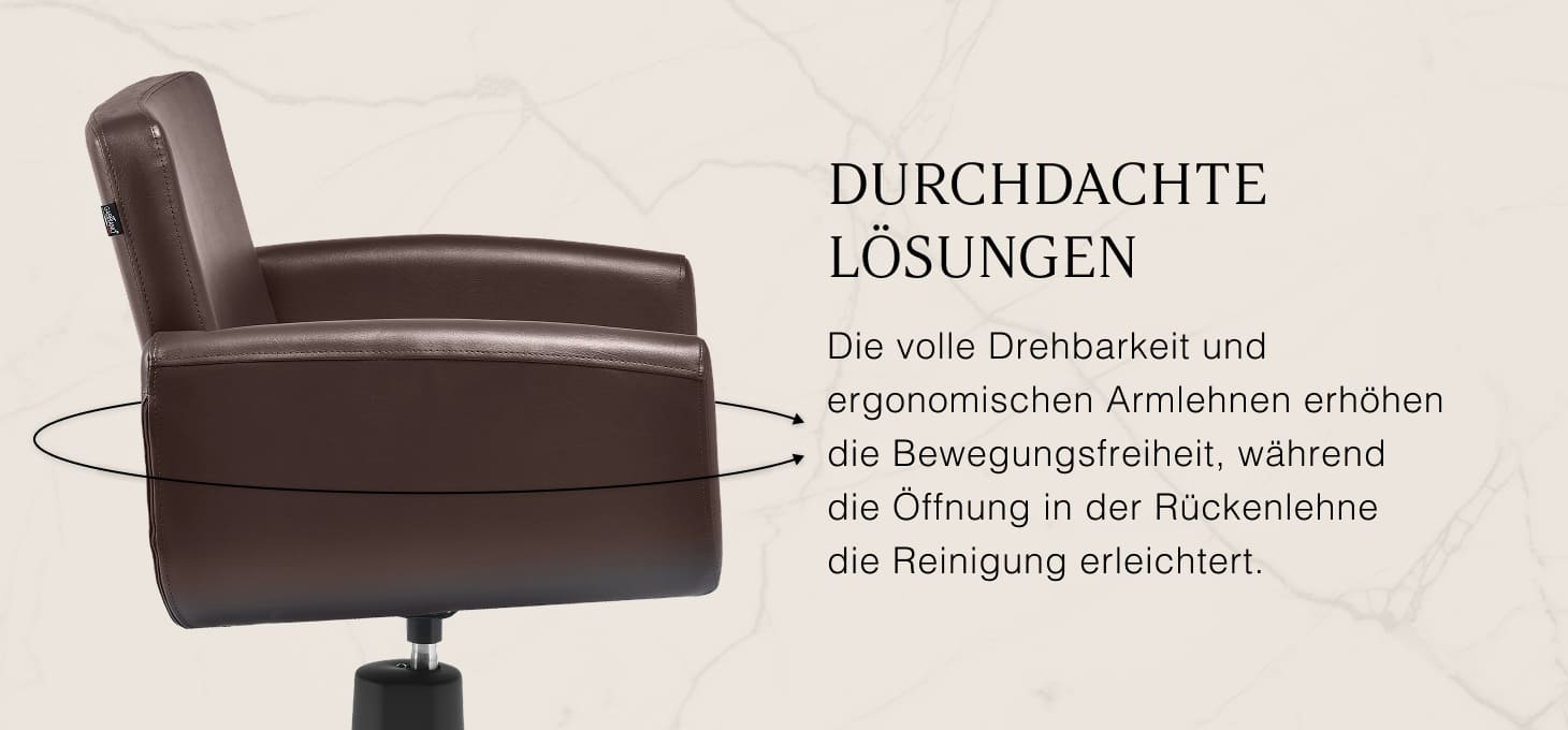 Ergonomische Armlehnen unterstützen die korrekte Haltung des Kunden, sorgen für Komfort und erleichtern präzise Schnitte und Stylings. Der Vollrotationsmechanismus sorgt für mehr Beweglichkeit und Bewegungsfreiheit und macht die Arbeit des Friseurs reibungsloser, effizienter und weniger belastend. Eine praktische Öffnung zwischen Rückenlehne und Sitz erleichtert die Sauberkeit und das schnelle Entfernen von Haaren an schwer zugänglichen Stellen. Dadurch ist die Vorbereitung des Standes für den nächsten Kunden effizient und hygienisch.