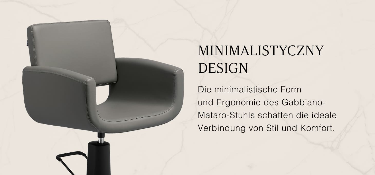 Der Friseurstuhl Gabbiano Mataro ist eine Kombination aus moderner Schlichtheit und Funktionalität. Dezent abgerundete Linien verleihen ihm eine Leichtigkeit, und ein stabiler, runder Sockel in mattem Grau unterstreicht seinen professionellen Look. Der Sitz mit angenehm anzufassendem Kunstleder in Schwarztönen sorgt für Komfort auch bei langen Behandlungen. Sorgfältig ausgewählte Materialien sorgen für Langlebigkeit, Feuchtigkeitsbeständigkeit und einfache Reinigung. Der Sessel passt sowohl zu modernen als auch zu klassischen Arrangements und unterstreicht den Stil und Charakter des Salons.