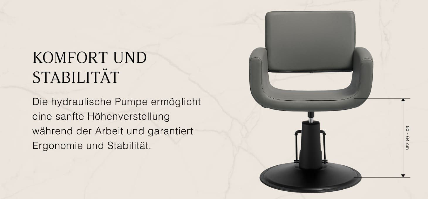 Mit dem langlebigen hydraulischen Wagenheber können Sie die Höhe des Sitzes auch während des Gebrauchs von 50 bis 64 cm einstellen. Dadurch wird die Arbeit ergonomischer und weniger belastend, und die Position kann sowohl an die Körpergröße des Friseurs als auch an die des Kunden angepasst werden. Die bequeme Rückenlehne bietet eine stabile Rückenstütze und erleichtert das Einnehmen einer bequemen Position, was besonders bei langen Behandlungen wichtig ist, um den Komfort und die Kundenzufriedenheit zu erhöhen.