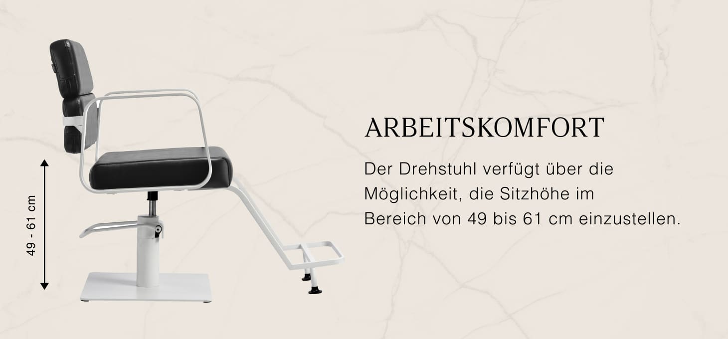 Mit einem langlebigen hydraulischen Lift können Sie das Sitzniveau zwischen 49 und 61 cm verstellen – auch wenn der Kunde auf dem Stuhl sitzt. Es bietet ein ergonomischeres Arbeitserlebnis, da die Sitzhöhe an die Körpergröße des Kunden und des Friseurs angepasst werden kann. Die optisch ansprechende Rückenlehne ermöglicht es Ihnen, eine bequeme Position einzunehmen, die eine hervorragende Rückenstütze bietet, was besonders bei vielen Behandlungsstunden wichtig ist. Ein großes Plus dieses Modells ist das Loch, das zwischen der Rückenlehne und dem Sitz bleibt. Es macht es einfacher, den Salon sauber zu halten, so dass Sie Ihre Haare leicht aus allen Ecken und Winkeln des Stuhls fegen können. Auf diese Weise können Sie die Vorbereitung des Arbeitsplatzes zwischen den Kunden optimieren.