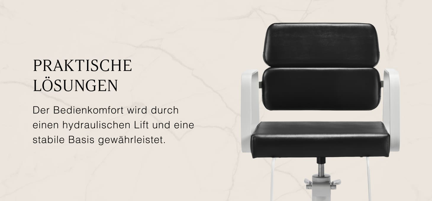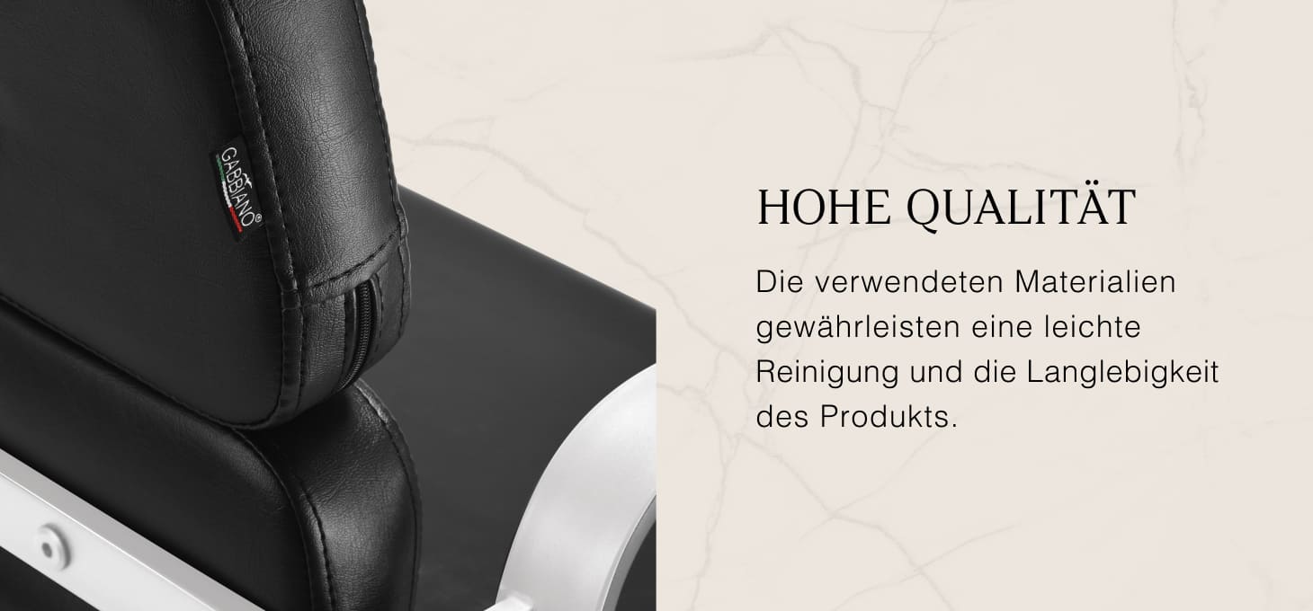 Die Füllung aus strapazierfähigem, verformungsbeständigem Schaumstoff und die Polsterung aus angenehm haptischem Kunstleder sorgen für die Langlebigkeit der Möbel und ihre komfortable Nutzung über einen langen Zeitraum. Außerdem machen sie die Geräte feuchtigkeitsbeständig, langlebig und leicht zu reinigen. Der Bezug in Schwarztönen verleiht ihm einen einzigartigen Charakter. Die Ausstattung zeichnet sich durch ein modernes Design aus, das den Sessel in vielen professionellen Salons großartig aussehen lässt.