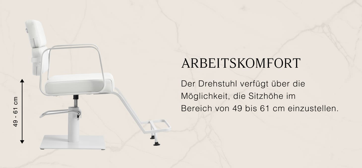 Mit einem langlebigen hydraulischen Lift können Sie das Sitzniveau zwischen 49 und 61 cm verstellen – auch wenn der Kunde auf dem Stuhl sitzt. Es bietet ein ergonomischeres Arbeitserlebnis, da die Sitzhöhe an die Körpergröße des Kunden und des Friseurs angepasst werden kann. Die optisch ansprechende Rückenlehne ermöglicht es Ihnen, eine bequeme Position einzunehmen, die eine hervorragende Rückenstütze bietet, was besonders bei vielen Behandlungsstunden wichtig ist. Ein großes Plus dieses Modells ist das Loch, das zwischen der Rückenlehne und dem Sitz bleibt. Es macht es einfacher, den Salon sauber zu halten, so dass Sie Ihre Haare leicht aus allen Ecken und Winkeln des Stuhls fegen können. Auf diese Weise können Sie die Vorbereitung des Arbeitsplatzes zwischen den Kunden optimieren.