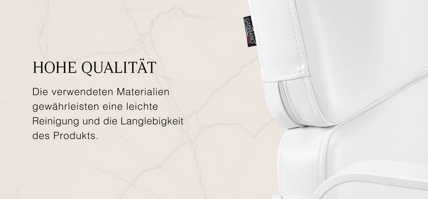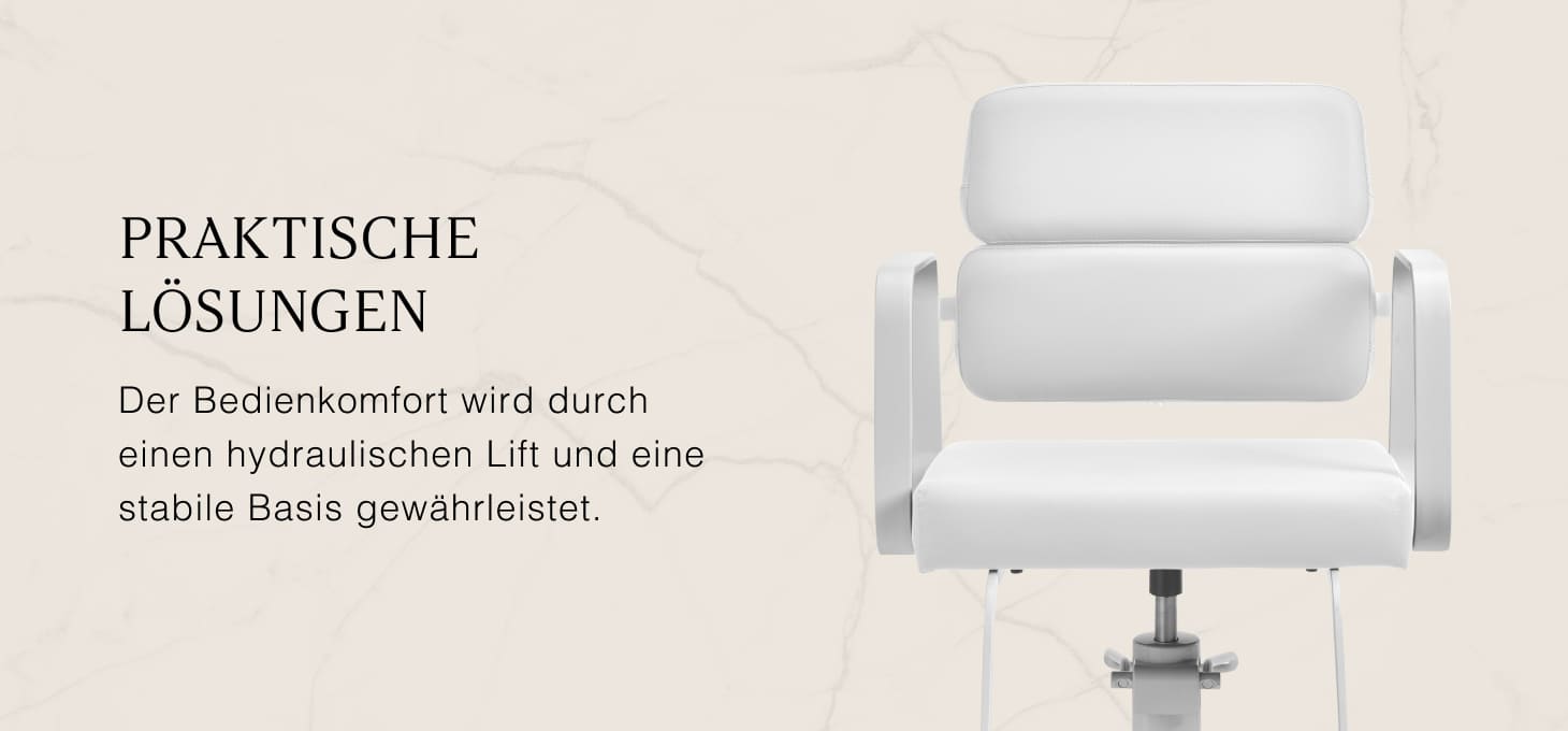 Die Füllung aus strapazierfähigem, verformungsbeständigem Schaumstoff und die Polsterung aus angenehm haptischem Kunstleder sorgen für die Langlebigkeit der Möbel und ihre komfortable Nutzung über einen langen Zeitraum. Außerdem machen sie die Geräte feuchtigkeitsbeständig, langlebig und leicht zu reinigen. Der Bezug in Weißtönen verleiht ihm einen einzigartigen Charakter. Die Ausstattung zeichnet sich durch ein modernes Design aus, das den Sessel in vielen professionellen Salons großartig aussehen lässt.