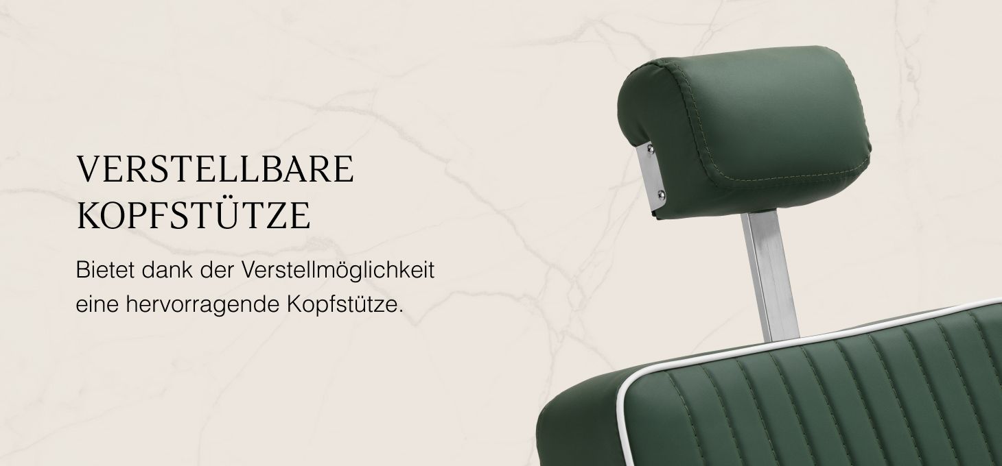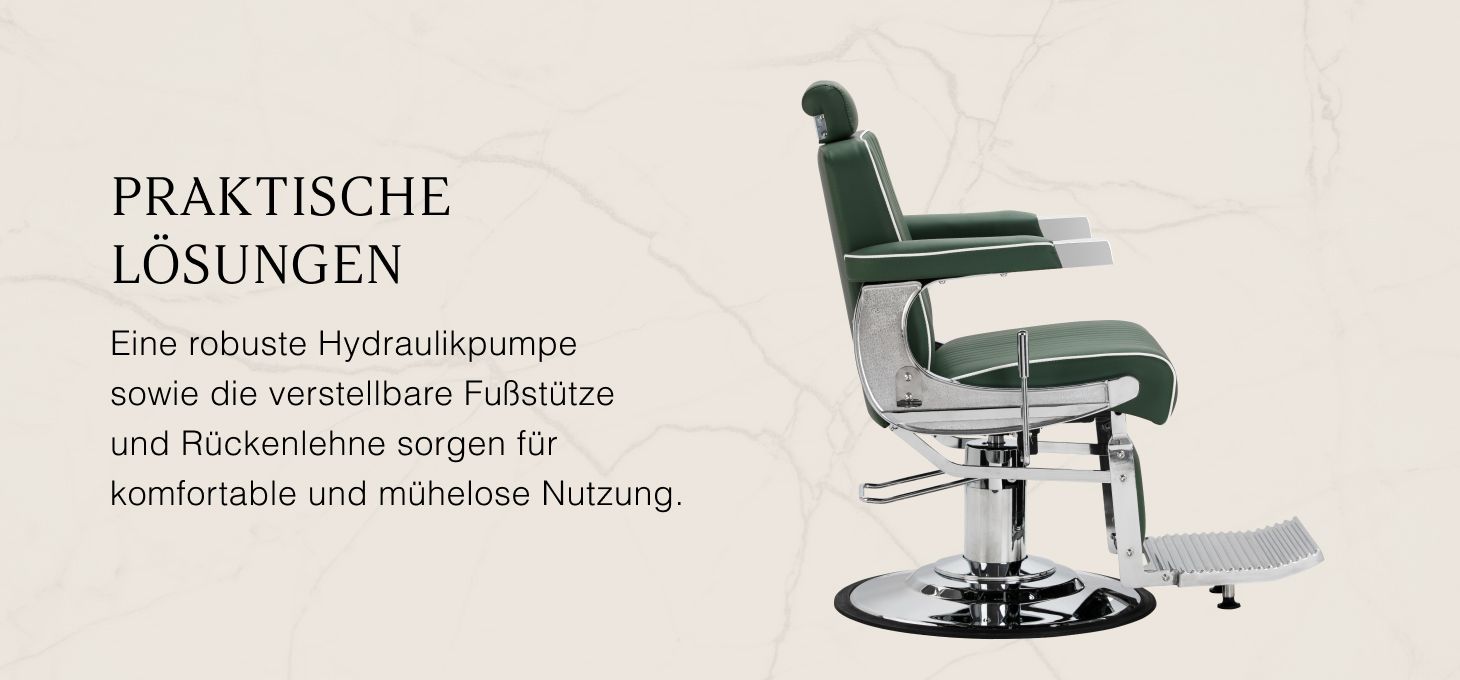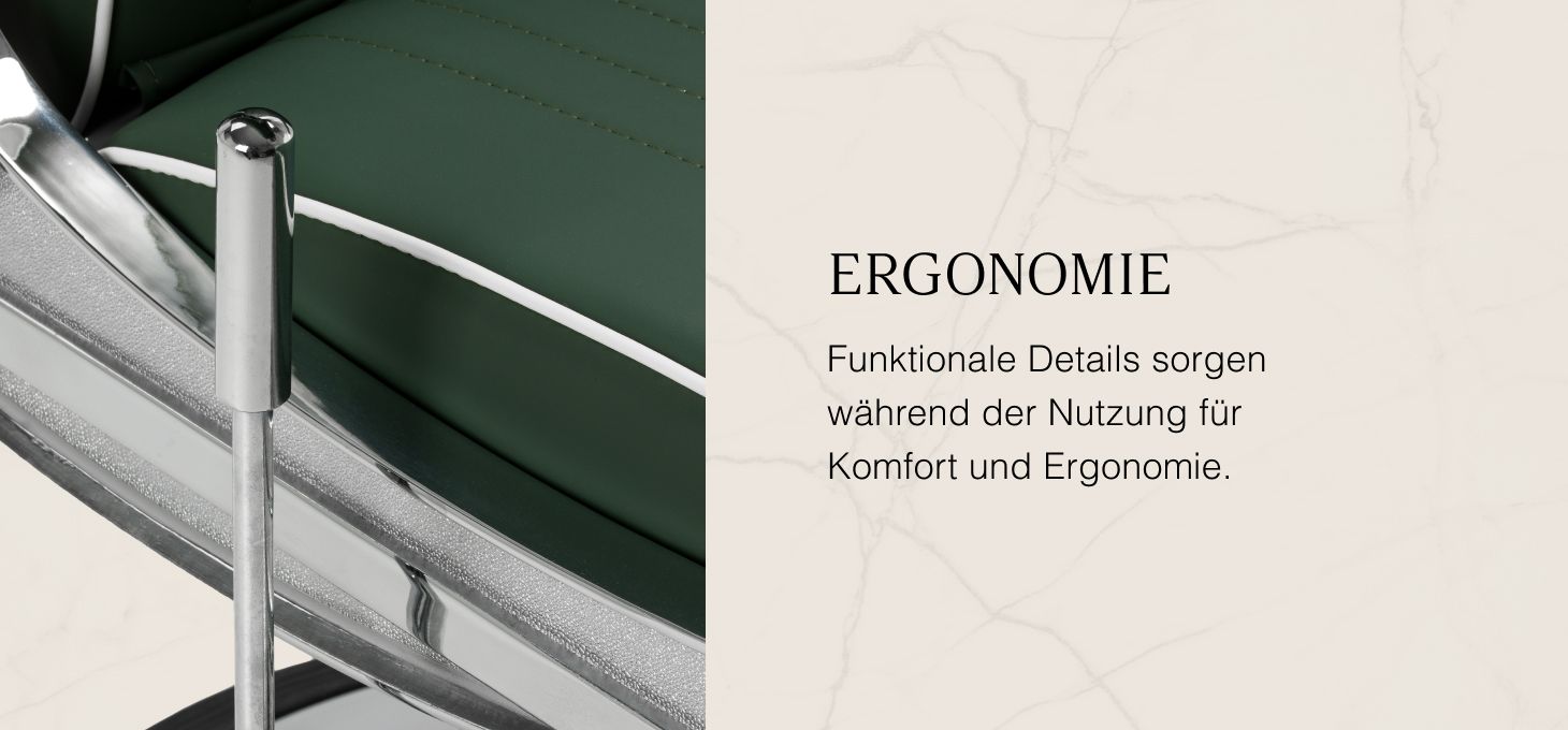 Die solide Konstruktion des Sockels sorgt für Stabilität und hohen Nutzungskomfort. Der Sitz ist mit verformungsbeständigem Schaumstoff gefüllt und mit weichem, mattem Kunstleder bezogen, das Langlebigkeit mit Komfort verbindet. Die für die Verarbeitung verwendeten Materialien sind feuchtigkeitsbeständig, langlebig und leicht zu reinigen, was den Sessel perfekt für die tägliche Arbeit macht. Stilvolle Nähte und Polsterungen in Grüntönen verleihen ihm einen einzigartigen Charakter, der perfekt zum Dekor moderner Friseursalons passt.
