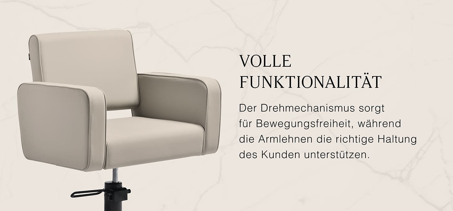 Der Sitz garantiert Komfort auch bei mehrstündigen Behandlungen. Ergonomische Armlehnen unterstützen die korrekte Haltung des Kunden, sorgen für Komfort und erleichtern präzise Schnitte und Stylings. Der Vollrotationsmechanismus sorgt für mehr Beweglichkeit und Bewegungsfreiheit und macht die Arbeit des Friseurs reibungsloser, effizienter und weniger belastend. Ein zusätzlicher Komfort ist die praktische Öffnung zwischen Rückenlehne und Sitzfläche, die es einfach macht, sauber zu bleiben und Haare an schwer zugänglichen Stellen schnell zu entfernen. Dadurch ist die Vorbereitung des Standes für den nächsten Kunden effizient und hygienisch.