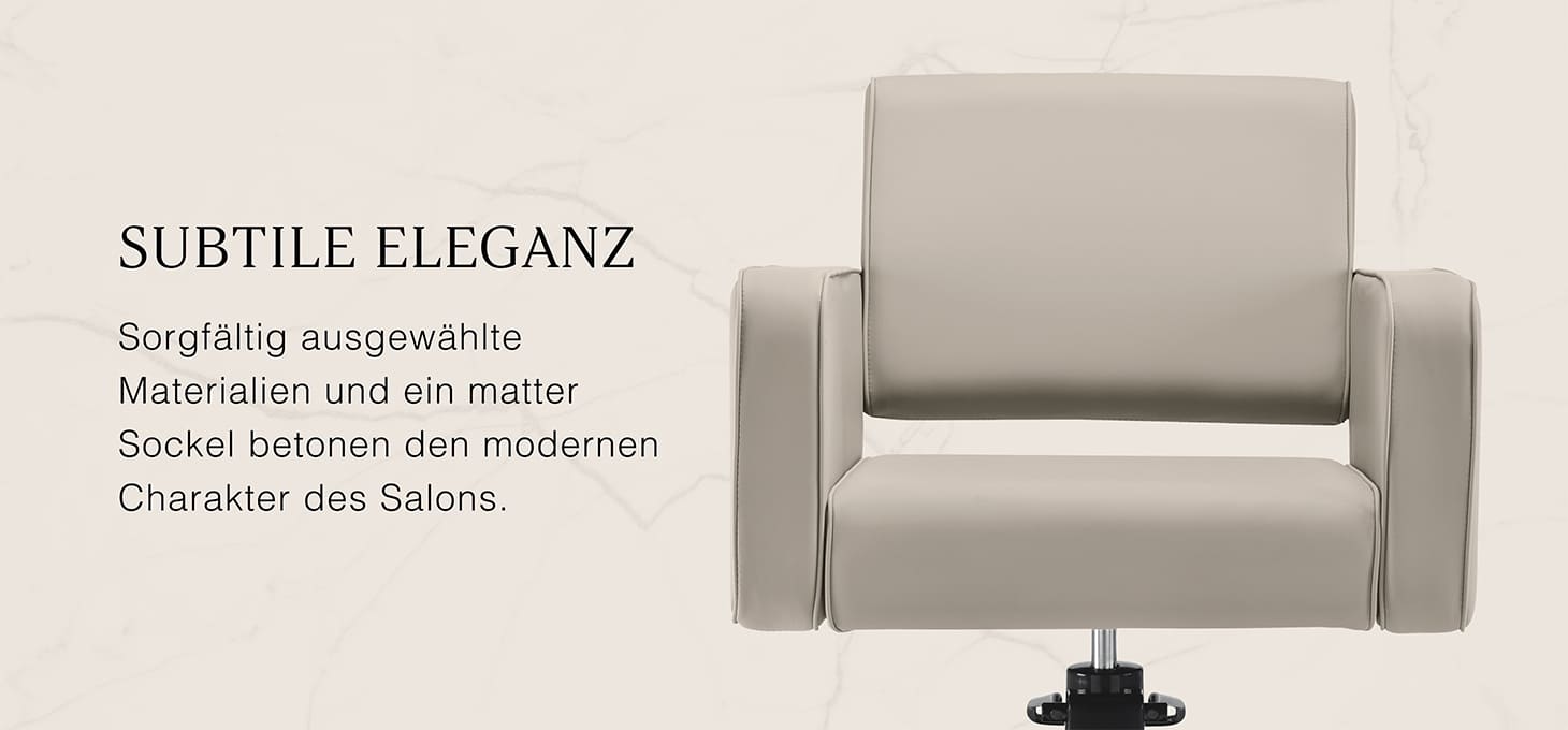 Der Friseurstuhl Gabbiano Bilbao verbindet minimalistisches Design mit Funktionalität und Komfort des täglichen Gebrauchs. Dezent abgerundete Linien verleihen ihm eine Leichtigkeit und einen modernen Charakter, während das stabile, quadratische Untergestell in mattem Grau- und Beige den stilvollen Look unterstreicht. Die weiche Füllung in Kombination mit dem angenehm anzufassenden Kunstleder in Grau- und Beigetönen sorgt für Komfort auch bei langen Behandlungen. Sorgfältig ausgewählte Materialien garantieren Langlebigkeit, Feuchtigkeitsbeständigkeit und einfache Reinigung. Der Sessel passt sowohl zu modernen als auch zu klassischen Arrangements und verleiht dem Wohnzimmer einen professionellen Charakter.