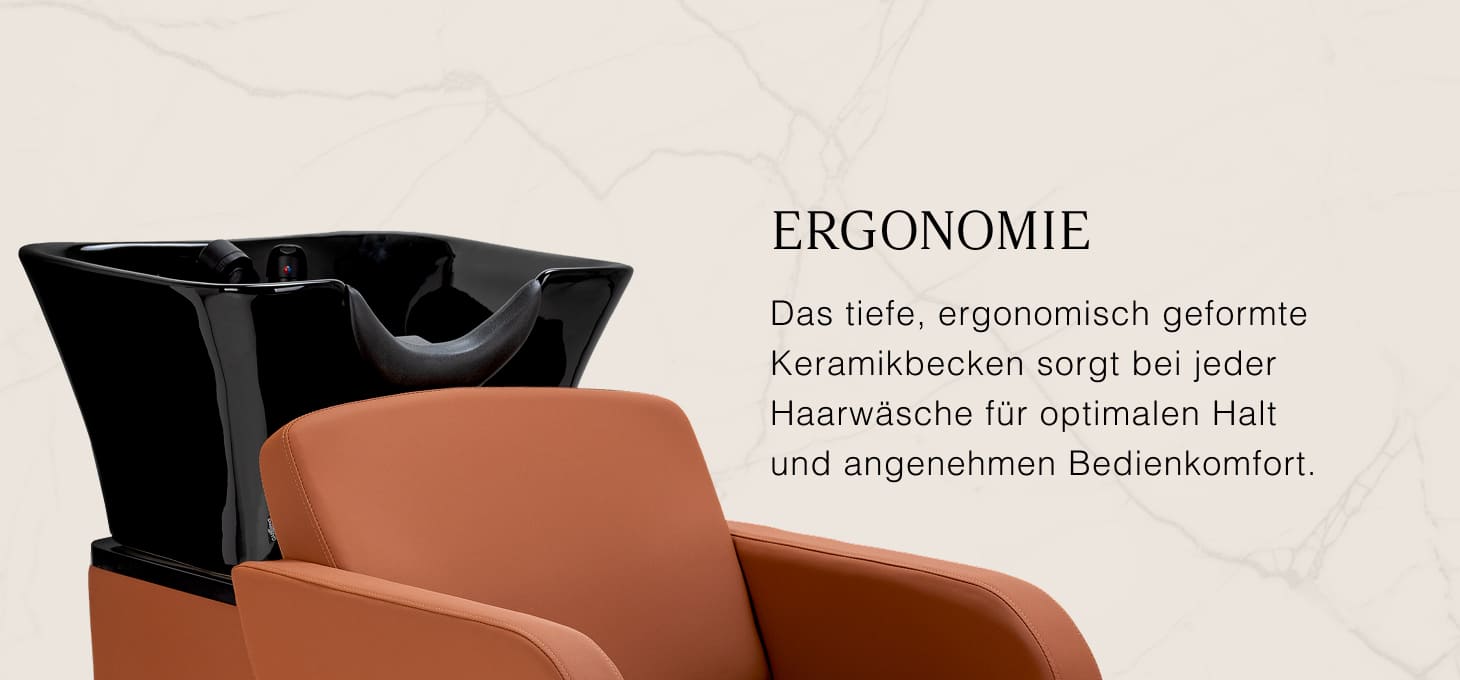 Die Keramik-Waschbeckenschüssel in Schwarztönen, mit moderner Form und angemessener Tiefe, verhindert effektiv das Spritzen von Wasser und Produkten, die während der Behandlungen verwendet werden, und ermöglicht es Ihnen, eine breite Palette von Dienstleistungen bequem und effizient durchzuführen. Der richtig profilierte Kragen und die geneigte Rückenlehne sorgen für Komfort und Halt beim Haarewaschen, und die Kunststoffkappe in Schwarztönen schützt den Kunden vor der Kälte der Keramikoberfläche und garantiert ein angenehmes Erlebnis während der Behandlung.