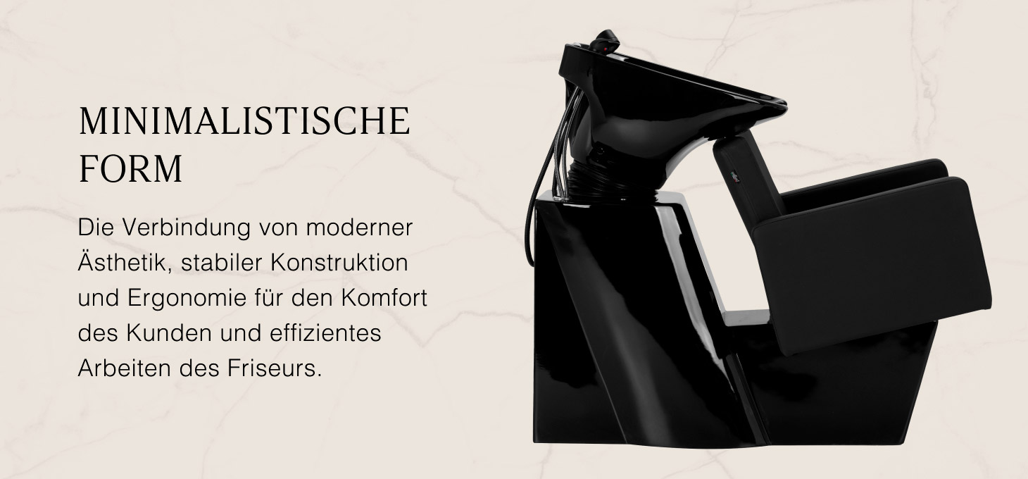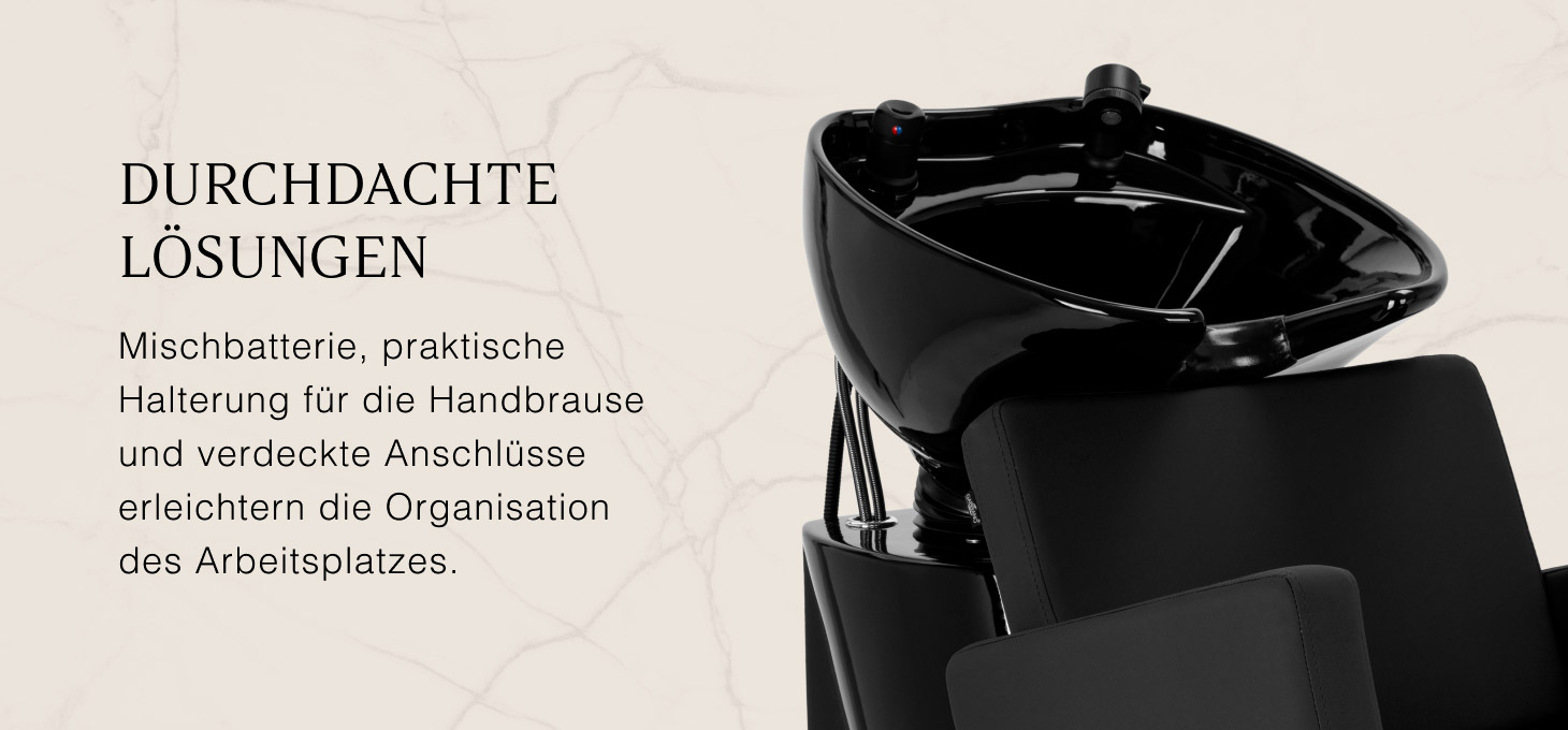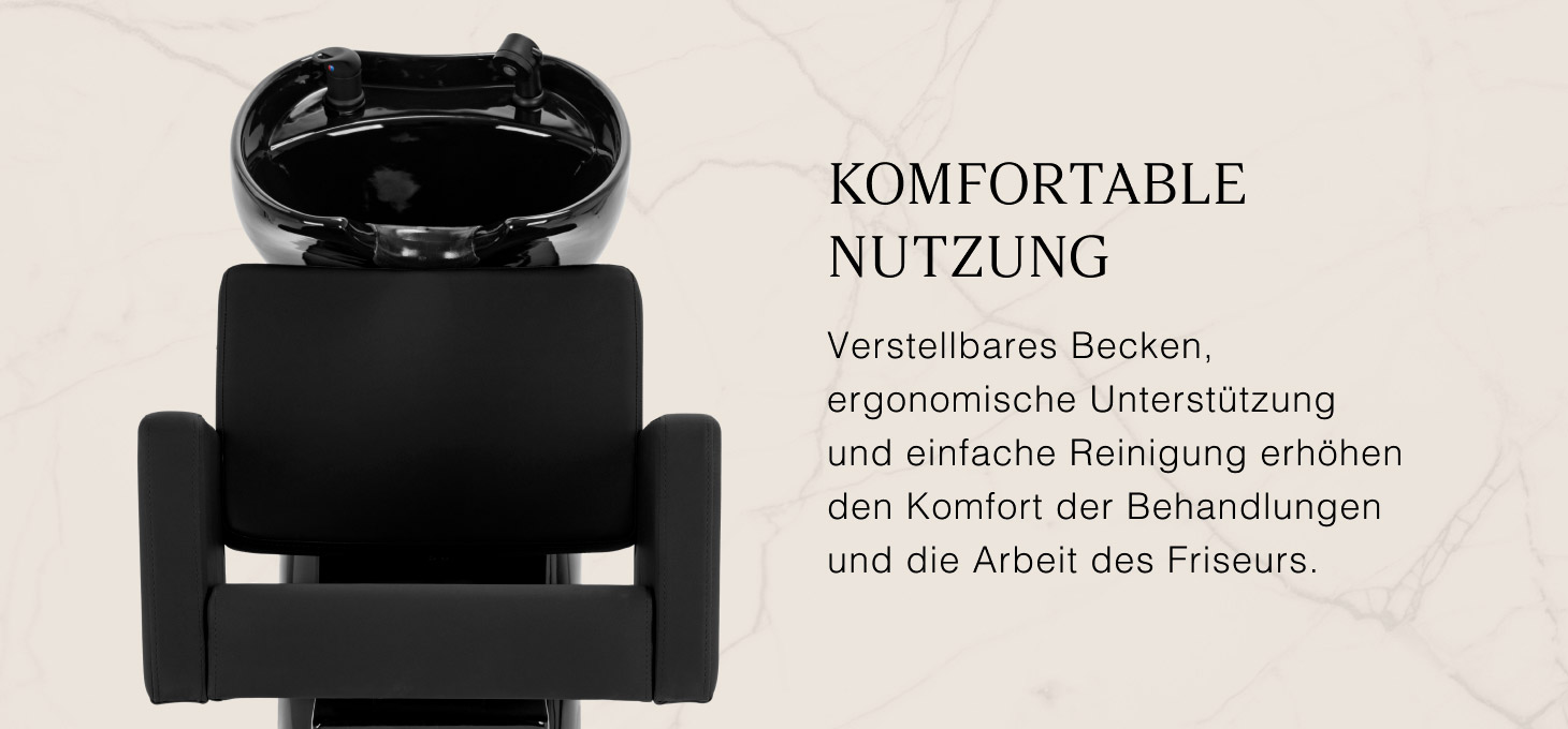 Die tiefe keramische Waschschüssel in Schwarztönen minimiert das Spritzen von Wasser und Kosmetika. Der verstellbare Neigungswinkel ermöglicht eine präzise Anpassung an die Bedürfnisse des Kunden. Das langlebige Material ist beständig gegen Verfärbungen, Kratzer und Chemikalien, während die glatte Oberfläche die Reinigung erleichtert. Der ergonomisch geformte Nackenbereich bietet bequemen Halt, und die schwarze Kunststoffauflage verhindert das Kältegefühl beim Kontakt mit der Keramik.